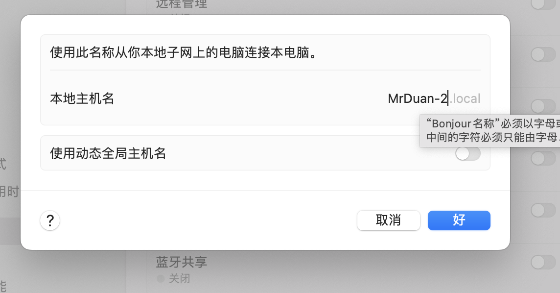 问题被标记为 排名最靠前的回复 以下用户的用户个人资料: tonyfromcalgary tonyfromcalgary 用户级别: 级别 6 16,084 积分 2023年1月17日 下午6:26 回应 某某48 有一种最普通的情况是,你的网络上有两个相同名称的电脑,把其中一个改名即可。另一种可能的情况是,一台 Mac 有两个网络连接,比如 Wi-Fi 和以太网都同时连接了网络,这个等同于前面说的,在同一个网络上有两个同名的电脑。另一种可能的情况同 Sariel 说的,比如你的 iCloud 的设备中不同的设备同名,那么不一个的名称改一下。也可能是连接的 router 的问题,它没有释放信息,造成假同名。比较少见的是网络服务造成的,你把这台 Mac 的共享服务都检查下,或者关了,或者看看有没有名称上的问题,比如共享服务较 “DrDuan 的共享”,结果空格后面的都去掉了,剩下同名的。 回复 链接