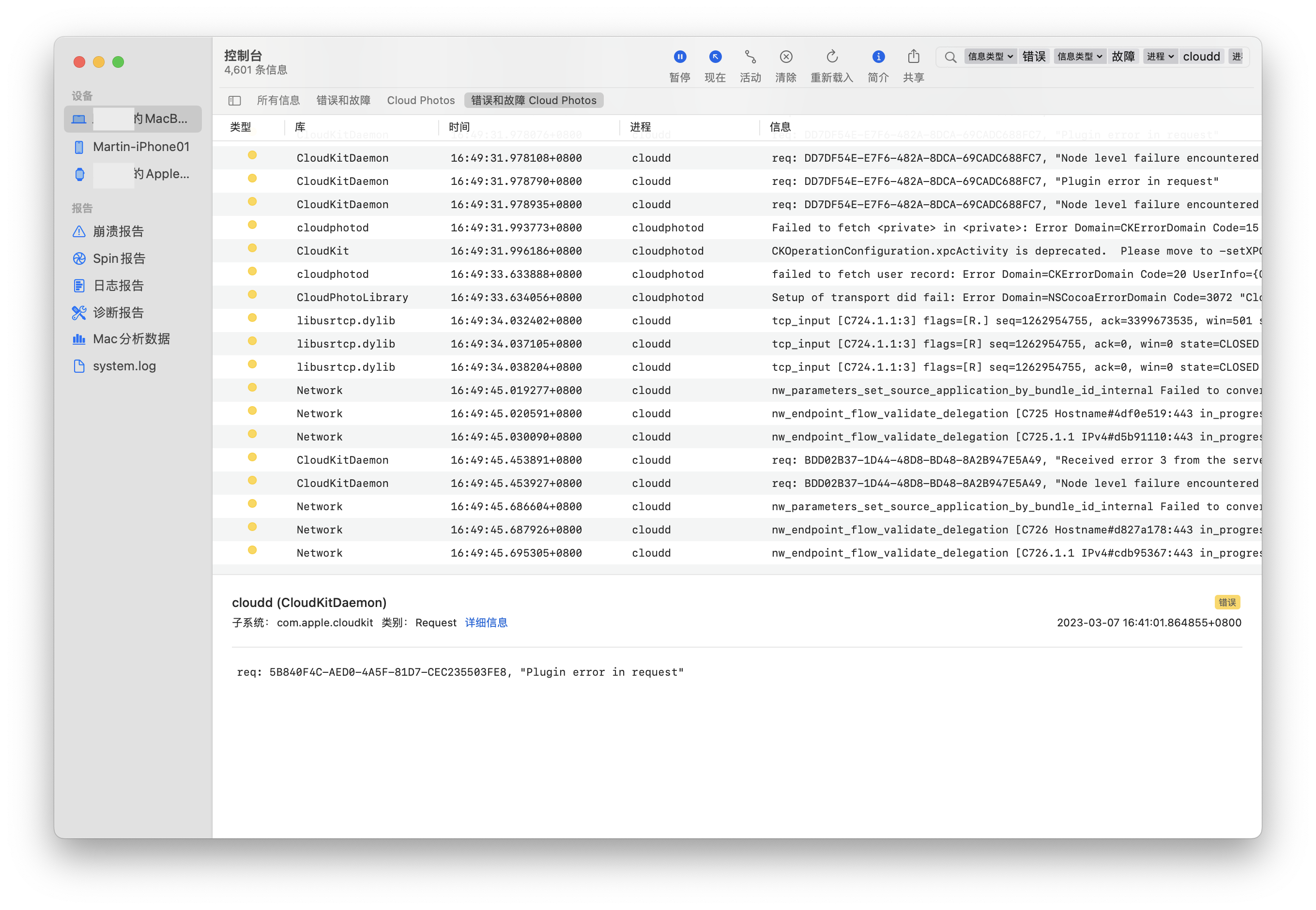 通过“控制台”应用可以看到iPhone和MacBook上运行的cloudphotod, cloudd进程在“照片”应用运行后有大量报错。猜测照片无法同步和这些错误有关,但是在运行iOS 15和macOS 12的设备上也有这些报错,所以也有可能此账户的iCloud照片服务在早前就开始异常,但是没有出现故障的现象。