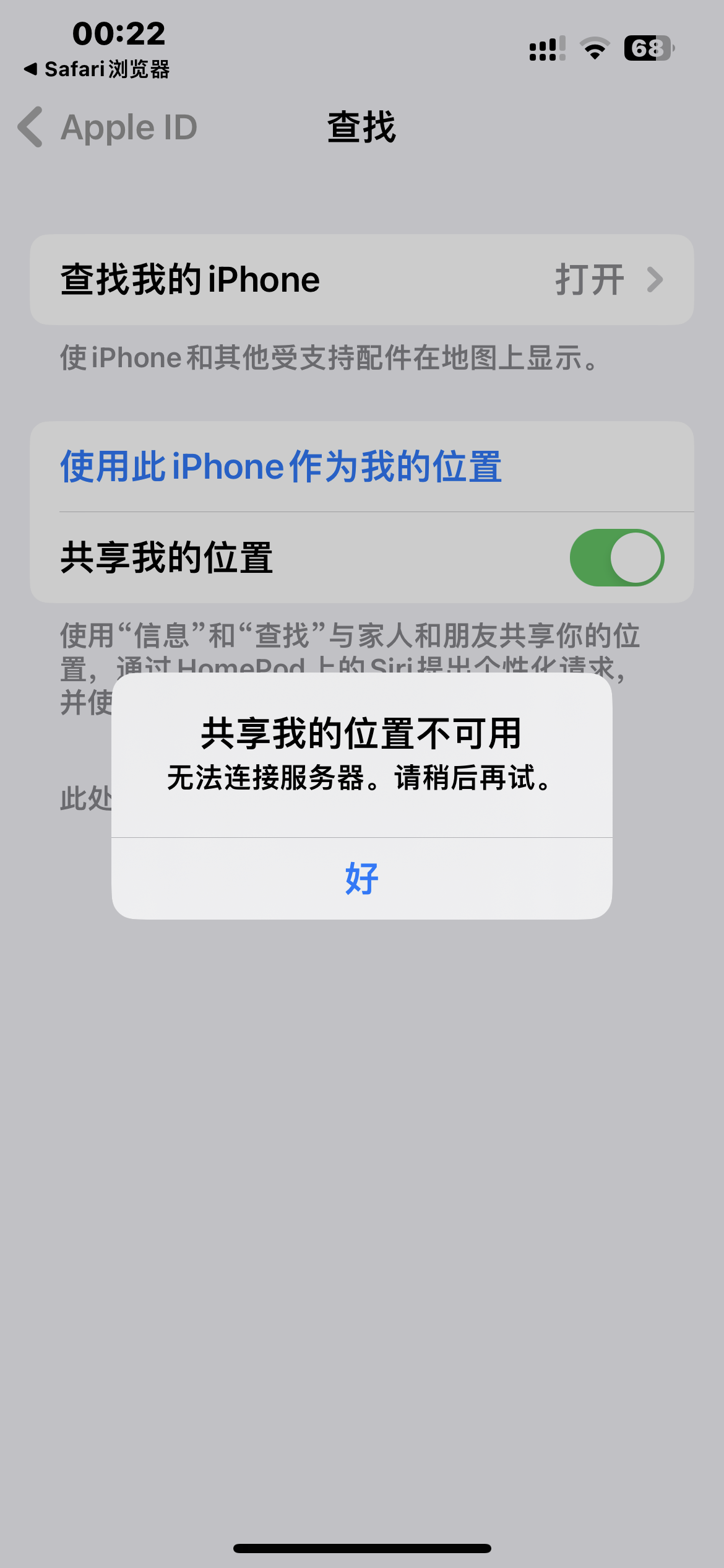 新购置的iPhone14,有Wi-Fi与5G,无法使用查找App功能,显示我的位置不可用,无法连接服务器。已经尝试过卸载重装,重启手机,无效。设置里面也显示无法连接服务来我去我的位置
