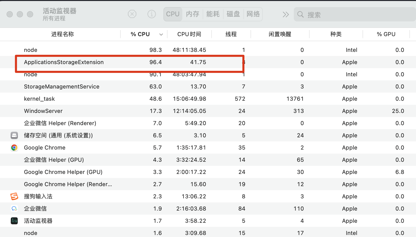 在没有打开系统设置-关于本机-存储空间设置面板的情况下 ApplicationsStorageExtension进程经常自己启动了 导致cpu占用特别高 这是怎么回事呢 每次发现cpu占用高 打开活动监视器就看到这个进程自己在运行 这个要怎么处理呢