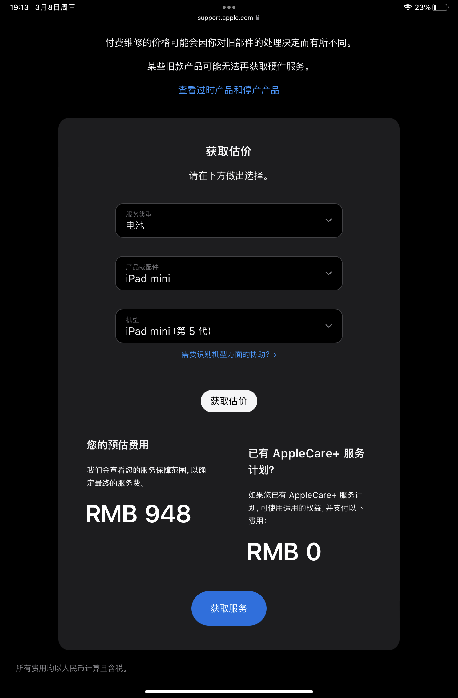 另外就是电池价格,可以参考iPad 维修和服务 - 官方 Apple 支持 (中国),iPad mini 5 的电池维修价格现在是 RMB 948。
