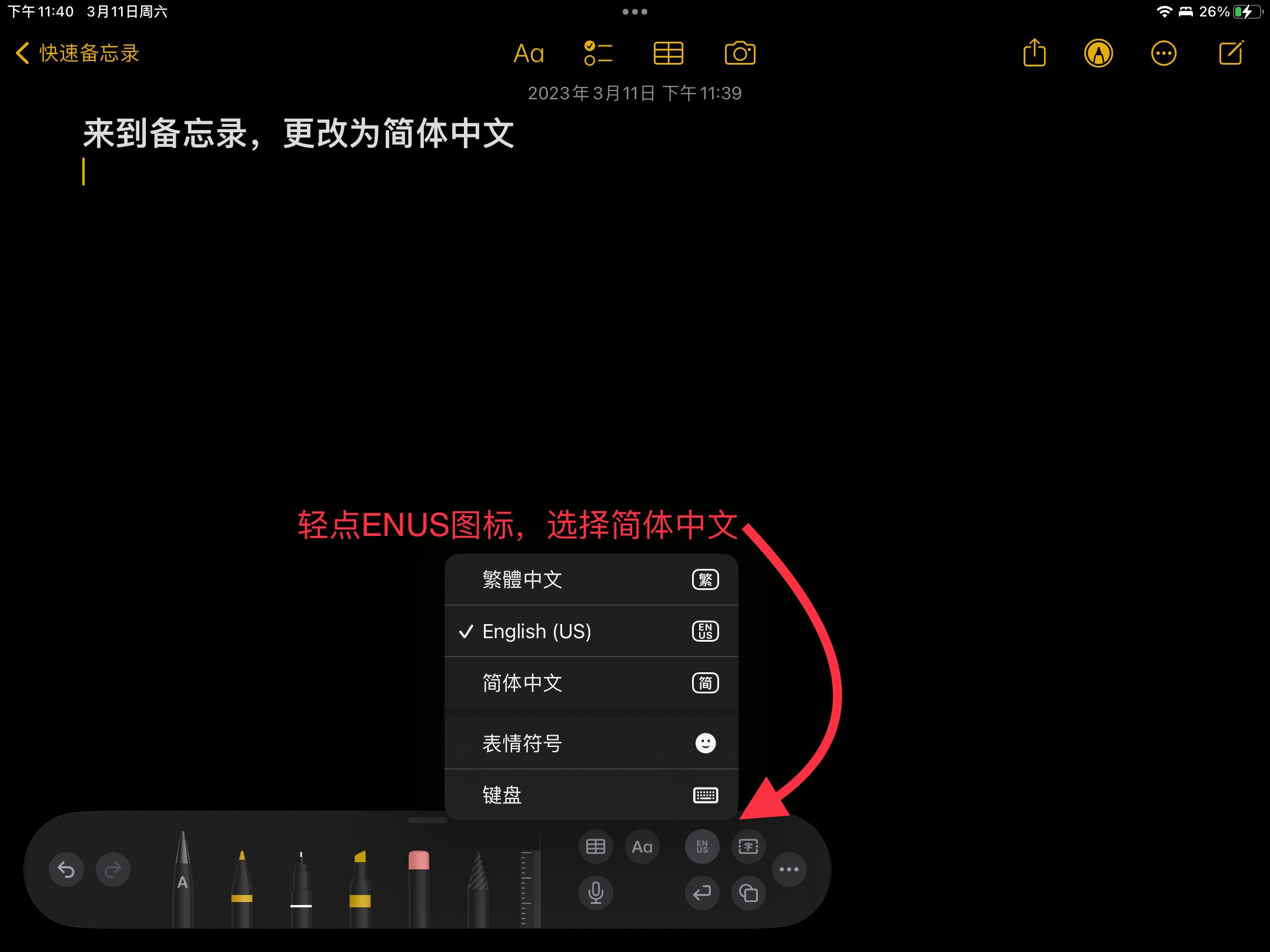 当你的Apple Pencil只能写出英文或其他语言时,只需要在备忘录或无边记等使用Apple Pencil识别的app中找到Apple Pencil切换笔类的悬框(图2),选择手写工具(笔左侧)后的 euns 图标(以英文为例)选择简体中文,这样就能识别出汉字。(所有iPad通用)