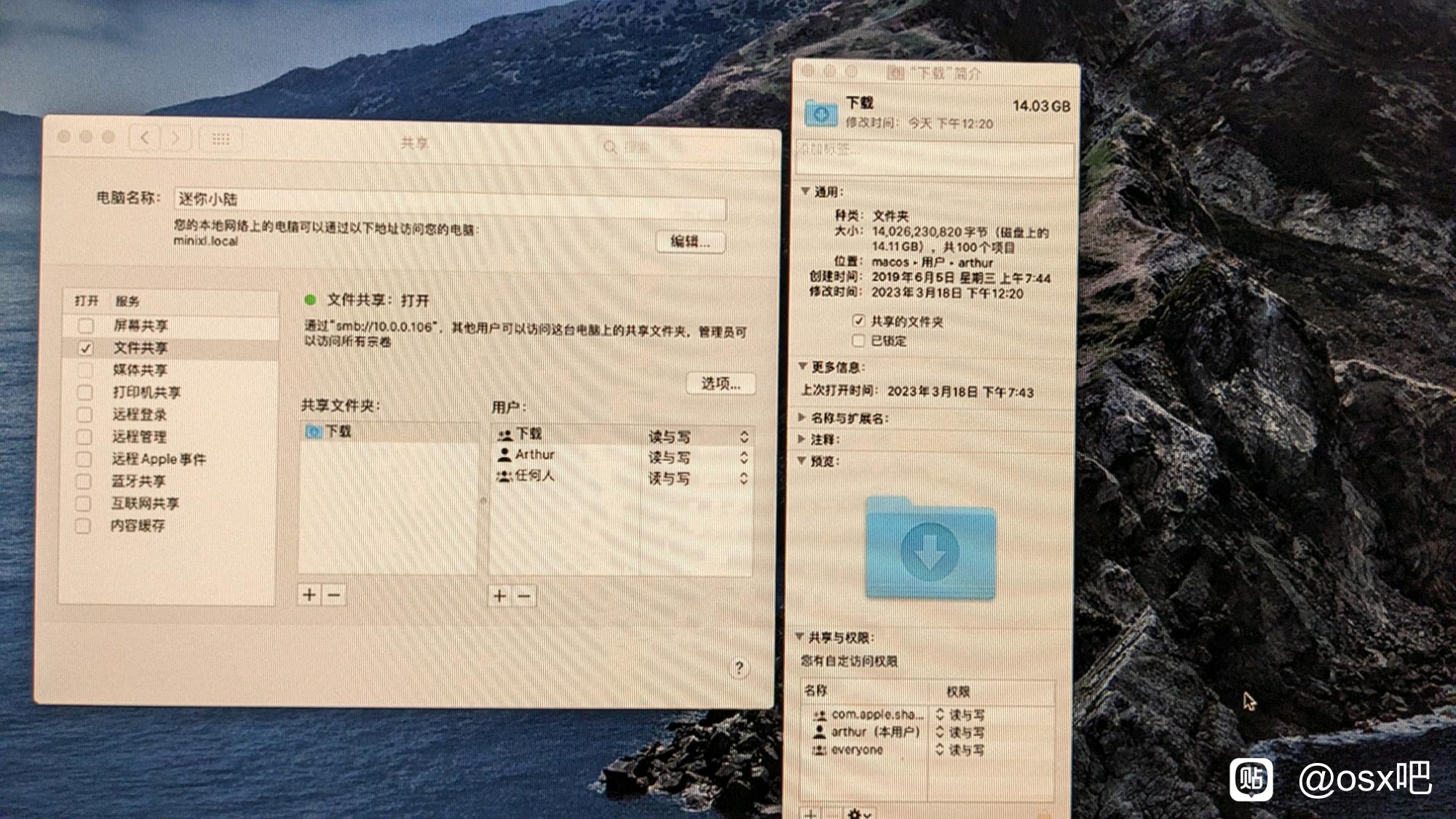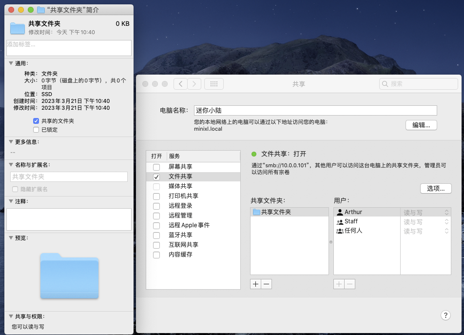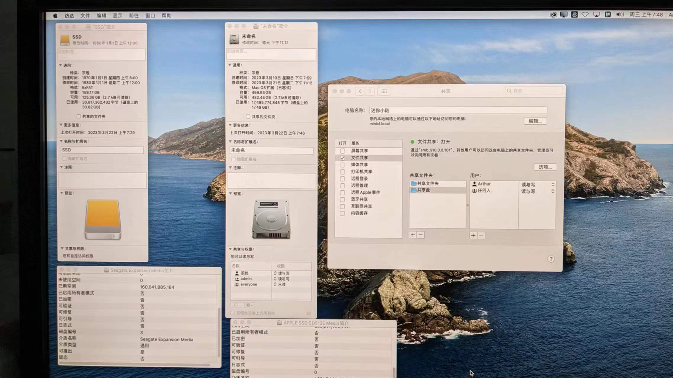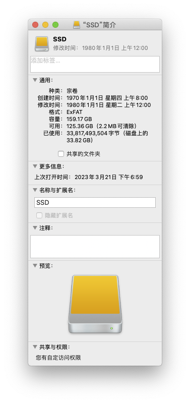 然后在这个外置硬盘(SSD)上建立一个文件夹,点简介后去找下面的共享与权限,是写着我可以读和写,但无法修改权限。也不能增加别人权限。