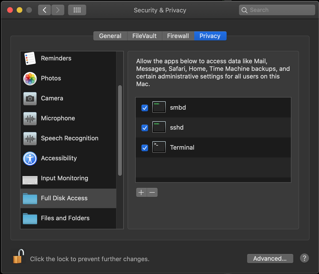 我到了这个full disk access. 但是用加号去电脑搜不到SMBD。是要另外安装?