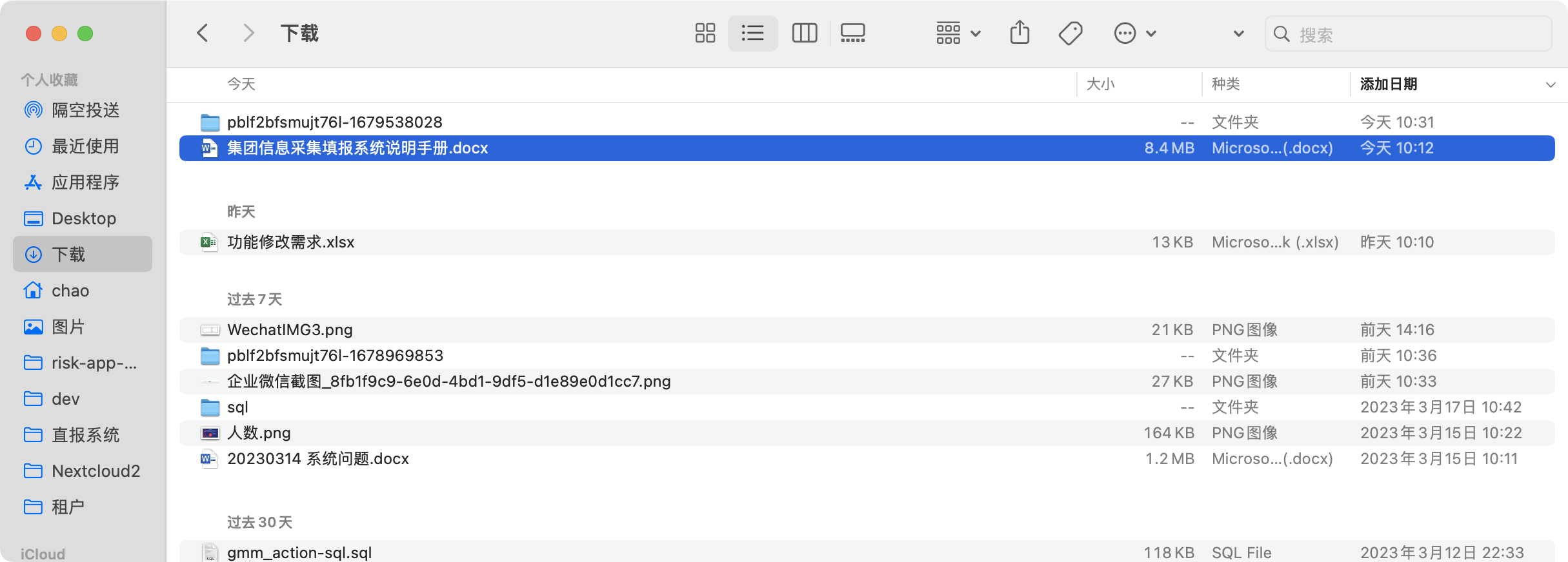 1 正常打开Finder后下载页面,按照添加时间倒序,功能是正常的,这里面我重点关注的文件就是 “集团信息采集填报系统说明手册.docx”,这是我今天创建的文件