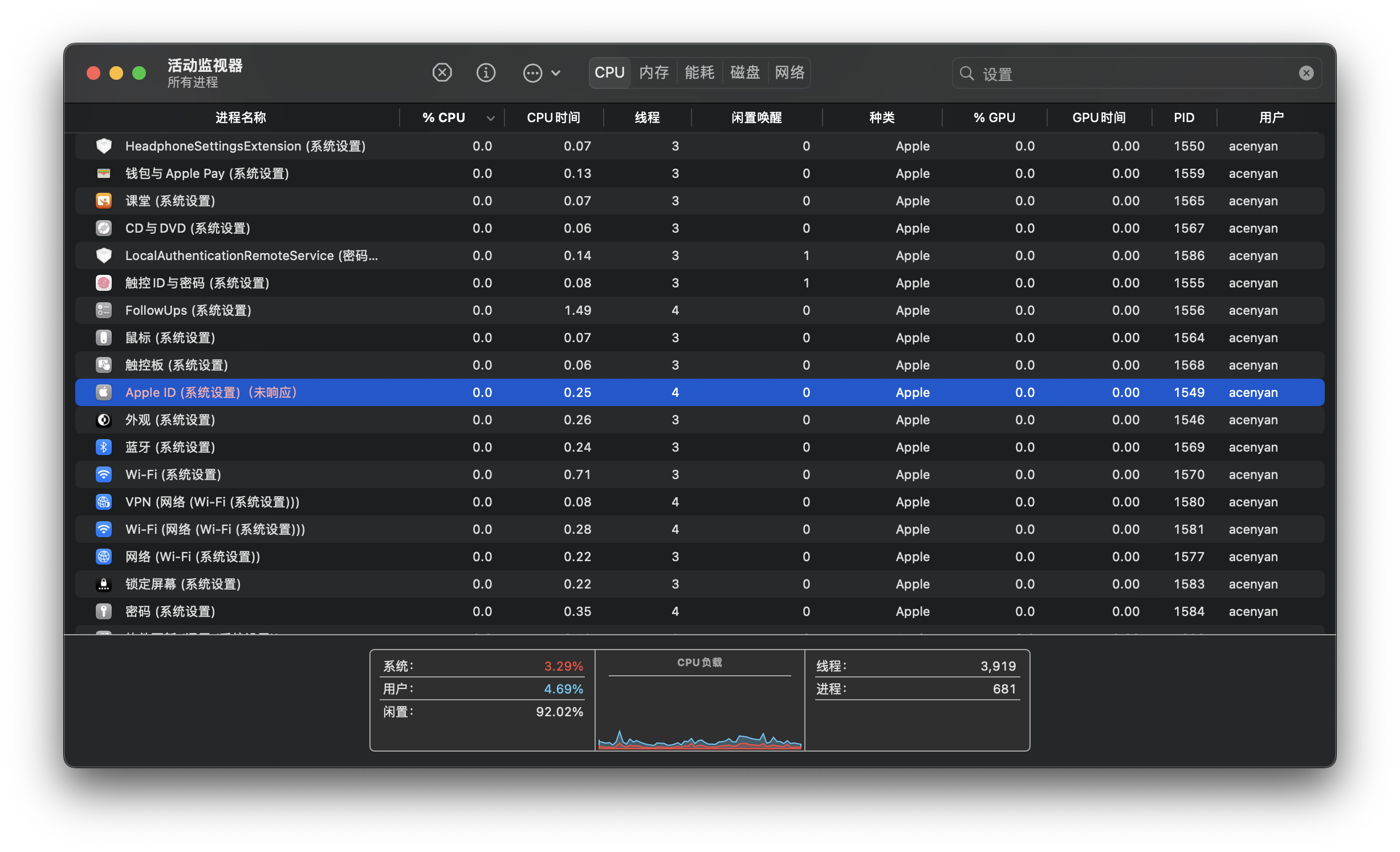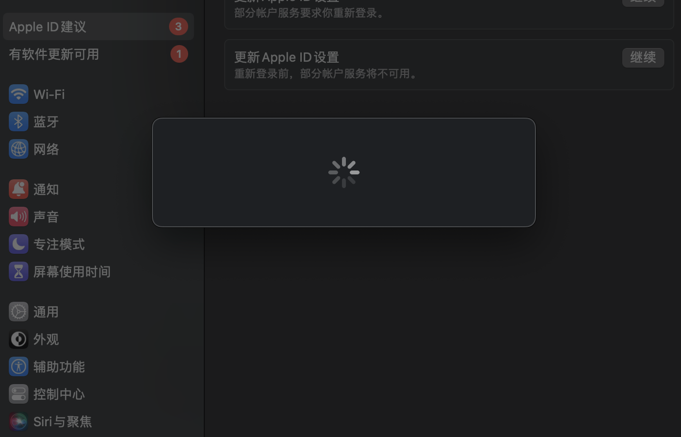 mac无法在“更新Apple ID设置”处正常验证账户,并且Apple ID设置进程已经停止响应。