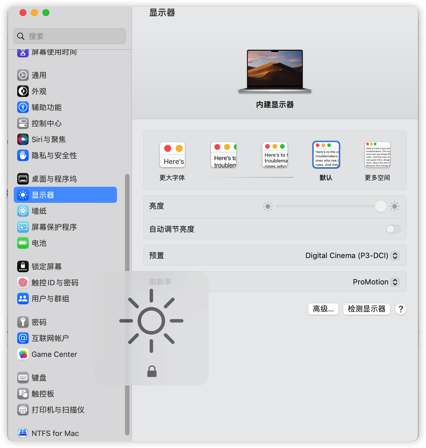 在系统设置>显示器>预置 中修改颜色描述文件为Digita Cinema (P3-DCl)时,无法调节屏幕亮度。修改回Apple XDR Display (P3-1600 nits) 又可以调节屏幕亮度。