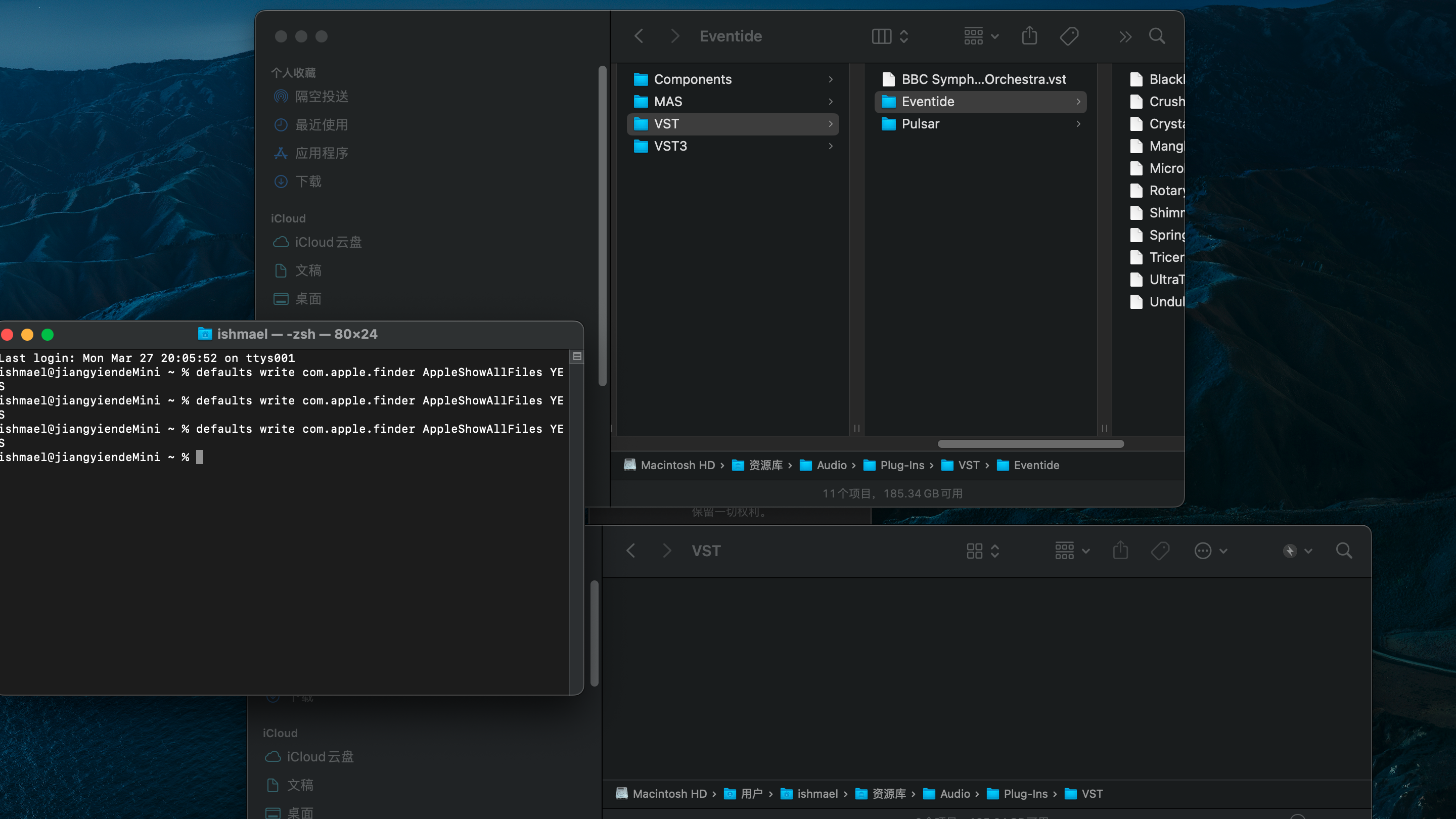 我安装了包括izotope ozone10和eventide的vst插件,但是发现我无法在访达中正常找到这些文件,我尝试删除部分插件但最终没有结果。但我尝试了izotope 的官方程序是有权限将其删除的,而我在另一款vst插件管理平台spitfire audio上获得了通过该软件打开library下的audio目录从而查看到被隐藏的vst文件。并且我试过官方的“解除文件隐藏方法”,请告诉我是不是因为安全管理或者什么问题阻止我自行管理我的vst文件?