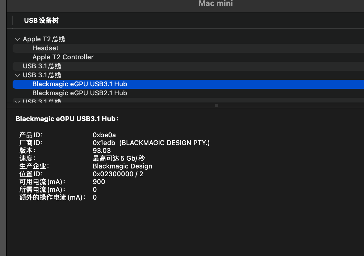 MAC mini 已经是新的系统了,连接Blackmagic eGPU RX580后,无法出现可使用图标,图形显卡里也没有对应的信息。但在USB线程里能看到连接的信息。请问怎么处理。
