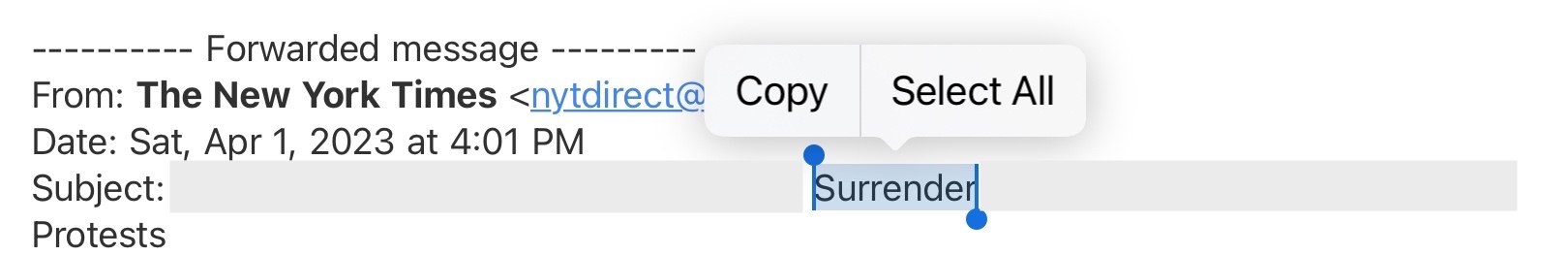 跟 iOS 版本无关,我在之前选单就只剩 copy,昨天升级之后还是这样毫无改善。 gmail app 在 4 月 3 日升级过 ,应该就是这个原因吧