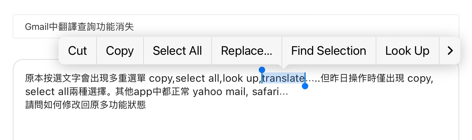 原本按選文字會出現多重選單 copy,select all,look up,translate…..但昨日操作時僅出現 copy, select all兩種選擇。 其他app中都正常 yahoo mail, safari…