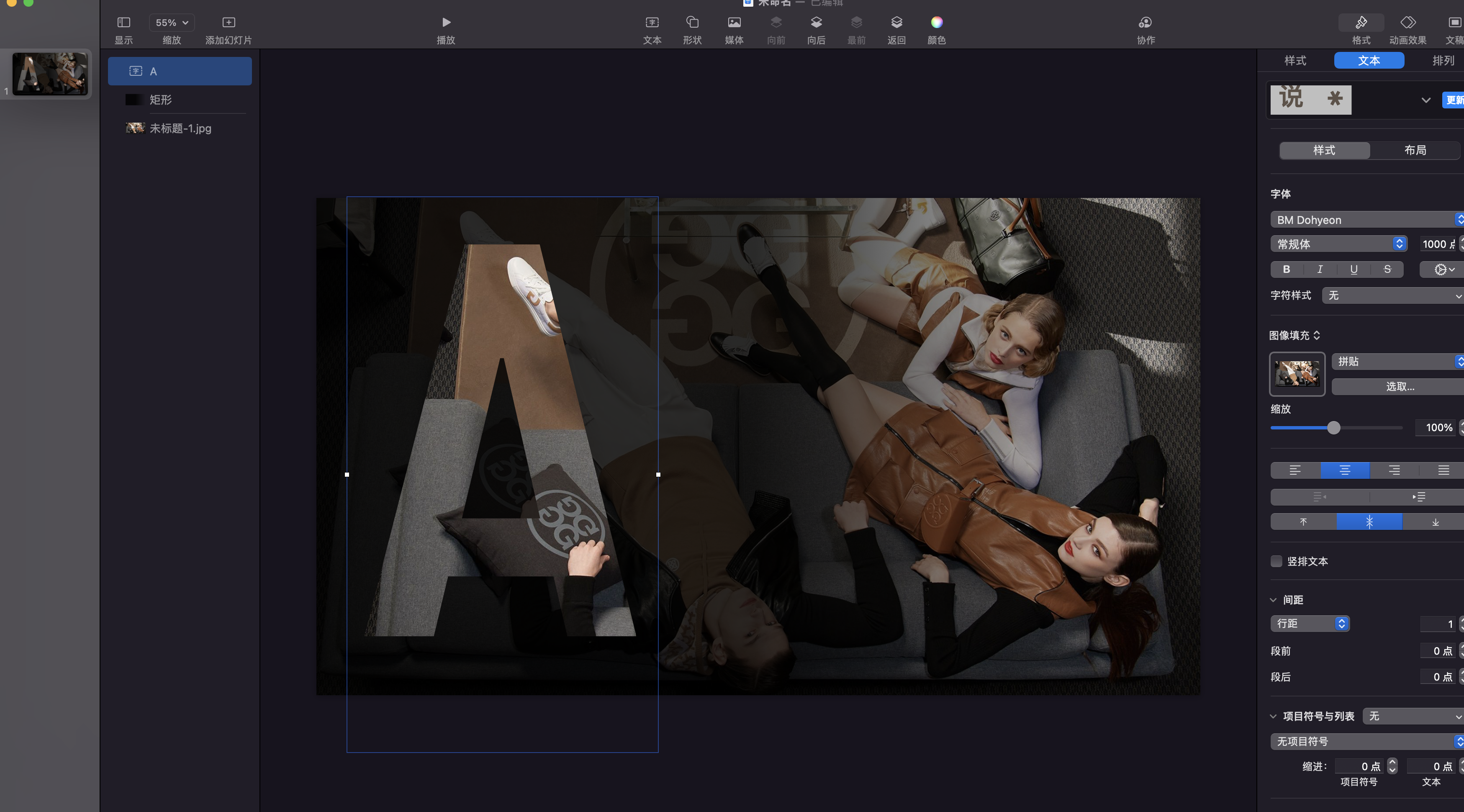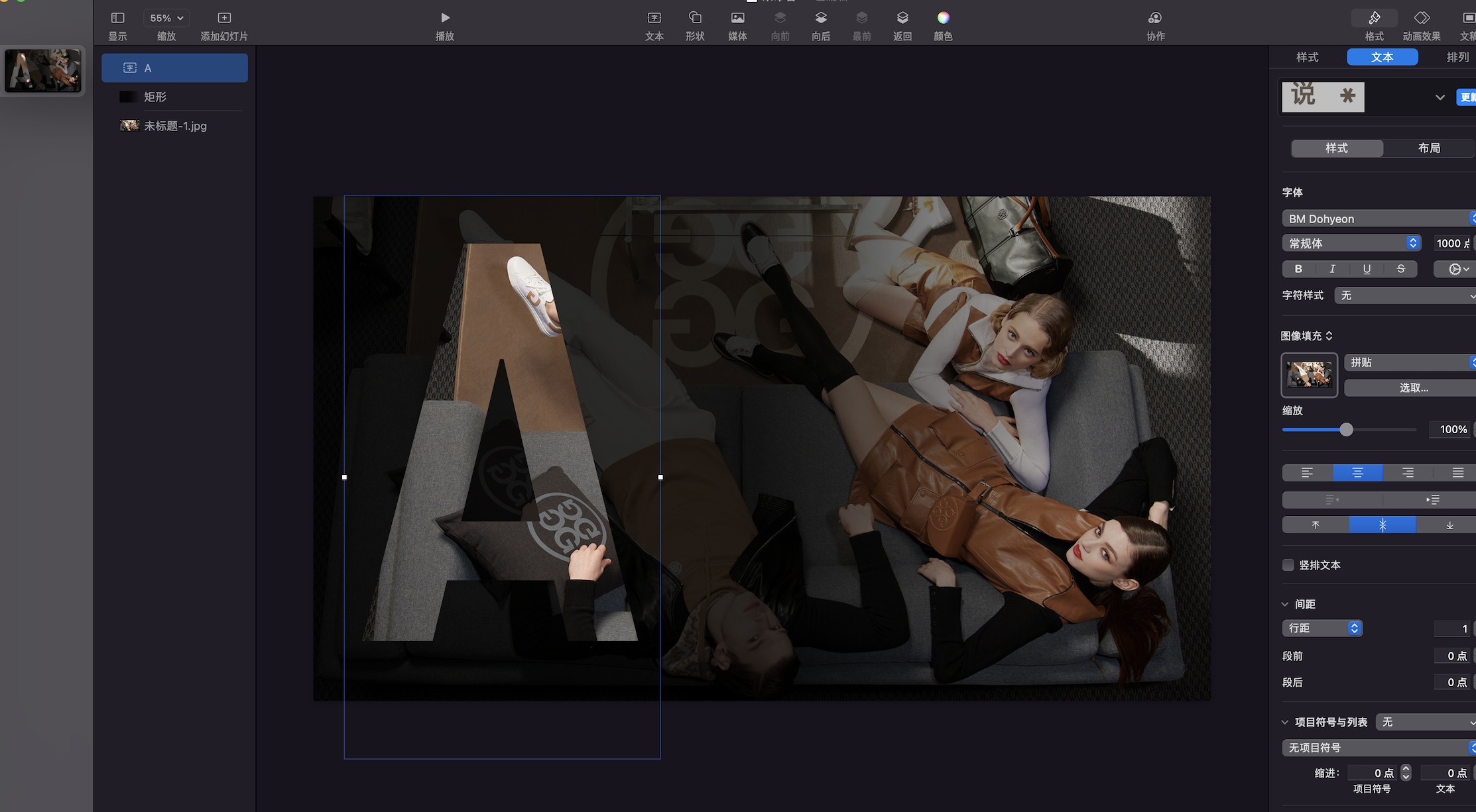 我想用底部的黑色形状层减去上方的文字层,可是keynote无法实现, 字母A是拿keynote做的,虽然文字可以填充图案,但是图片不能调整对齐方式,所以无法和底部背景保持一致。 字母D是拿PS软件做的