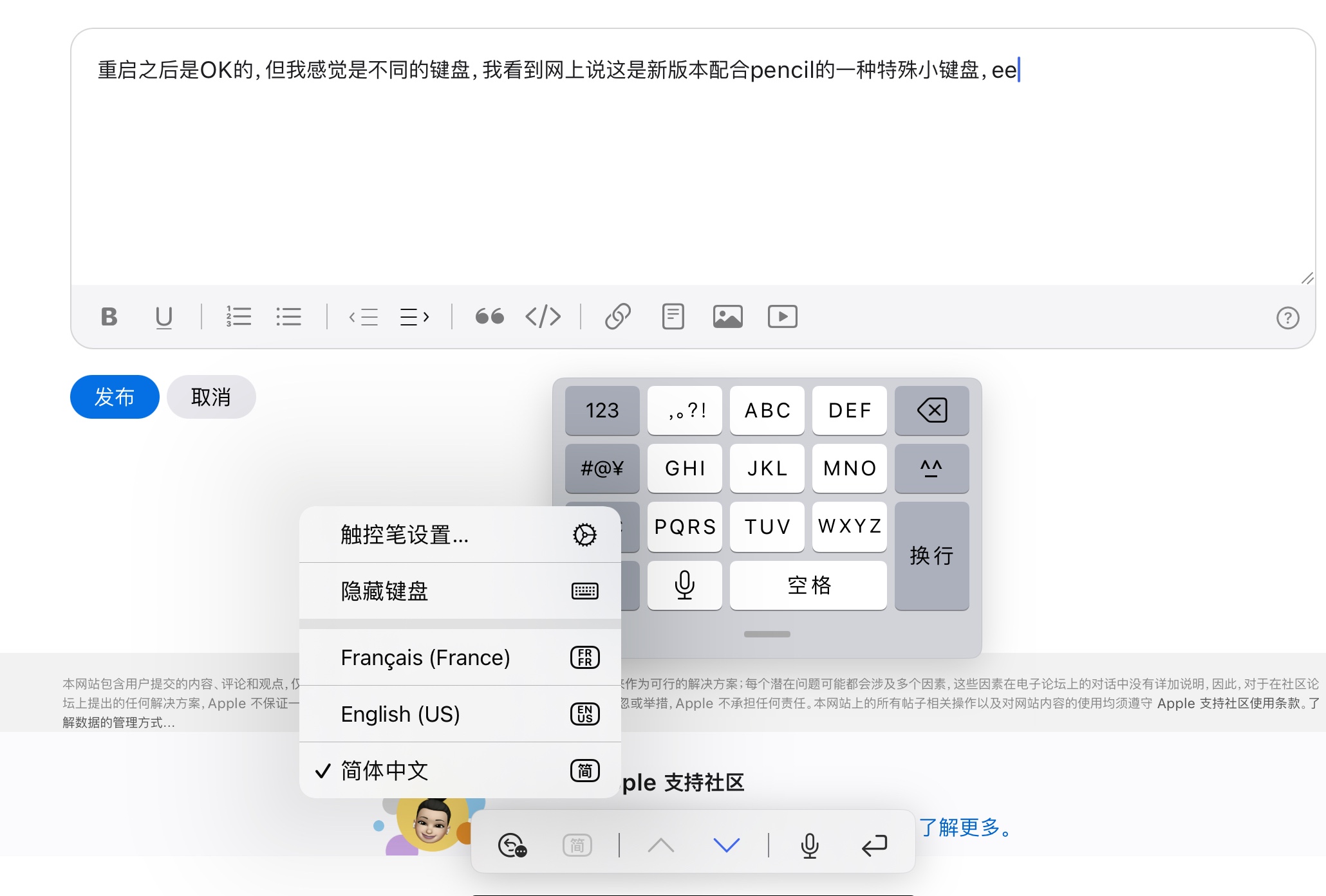 重启之后是OK的,但我感觉是不同的键盘,我看到网上说这可能是是新版本配合pencil的一种特殊小键盘,我试了一下,这种时候出现的小键盘他就是无法放大的,得在这里选择隐藏键盘然后才会出现大的键盘,我希望这能解决问题,解决不了我再来问,谢谢🙏