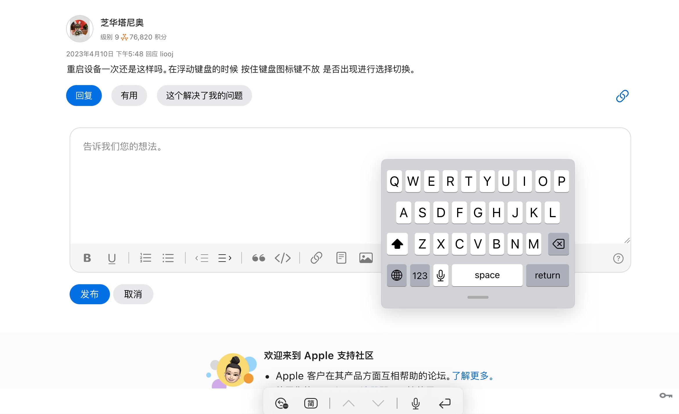 我了解到你在使用 iPad 时遇到了浮动键盘无法恢复正常的情况。由于暂时还没有其他社区用户来回复你的帖子,在此之前,建议你不妨先尝试以下操作步骤: