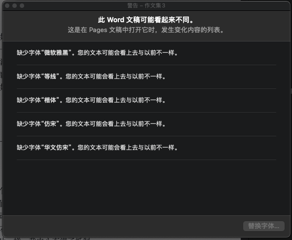 已经安装了将要使用的字体,为什么Pages显示缺少字体?