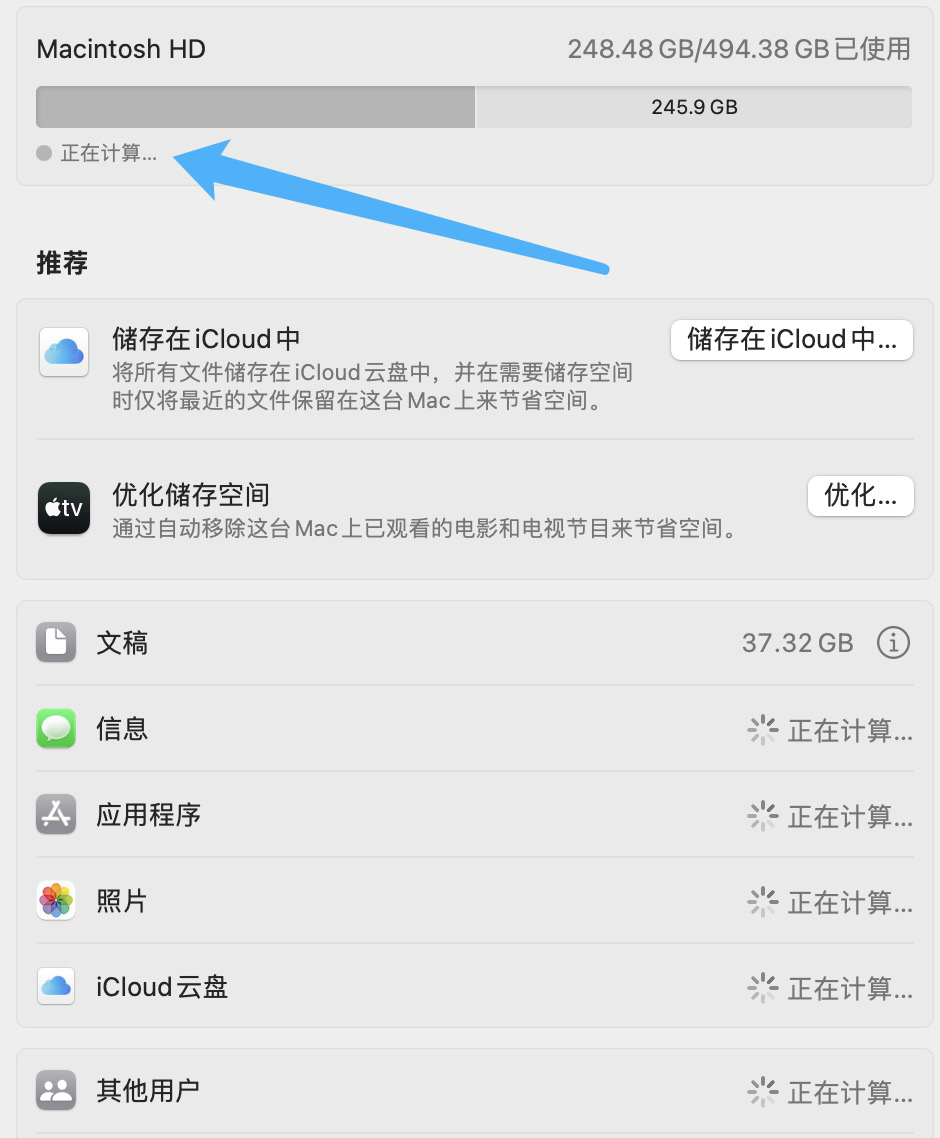 M1芯片的Macbook电脑的磁盘空间一直在计算中,13.2.1的系统,几个小时都一直在运算中