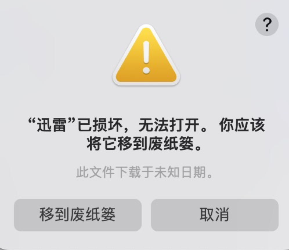 mac mini2020 升级Ventura后,一直提示“迅雷”已损坏,无法打开。 你应该将它移到废纸篓。