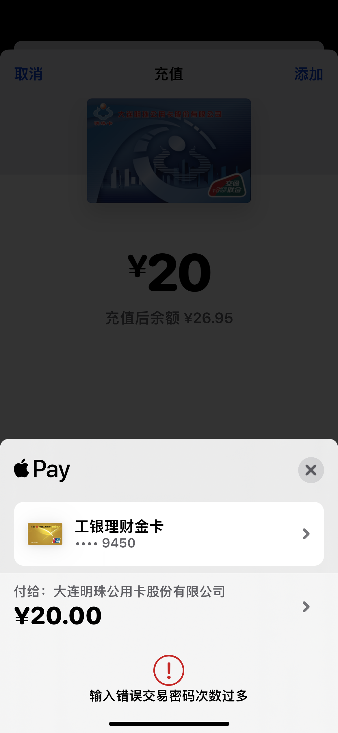 钱包里用绑定银行卡给公交卡充值,提示输入错误交易密码次数过多,过了几天充值依然报错