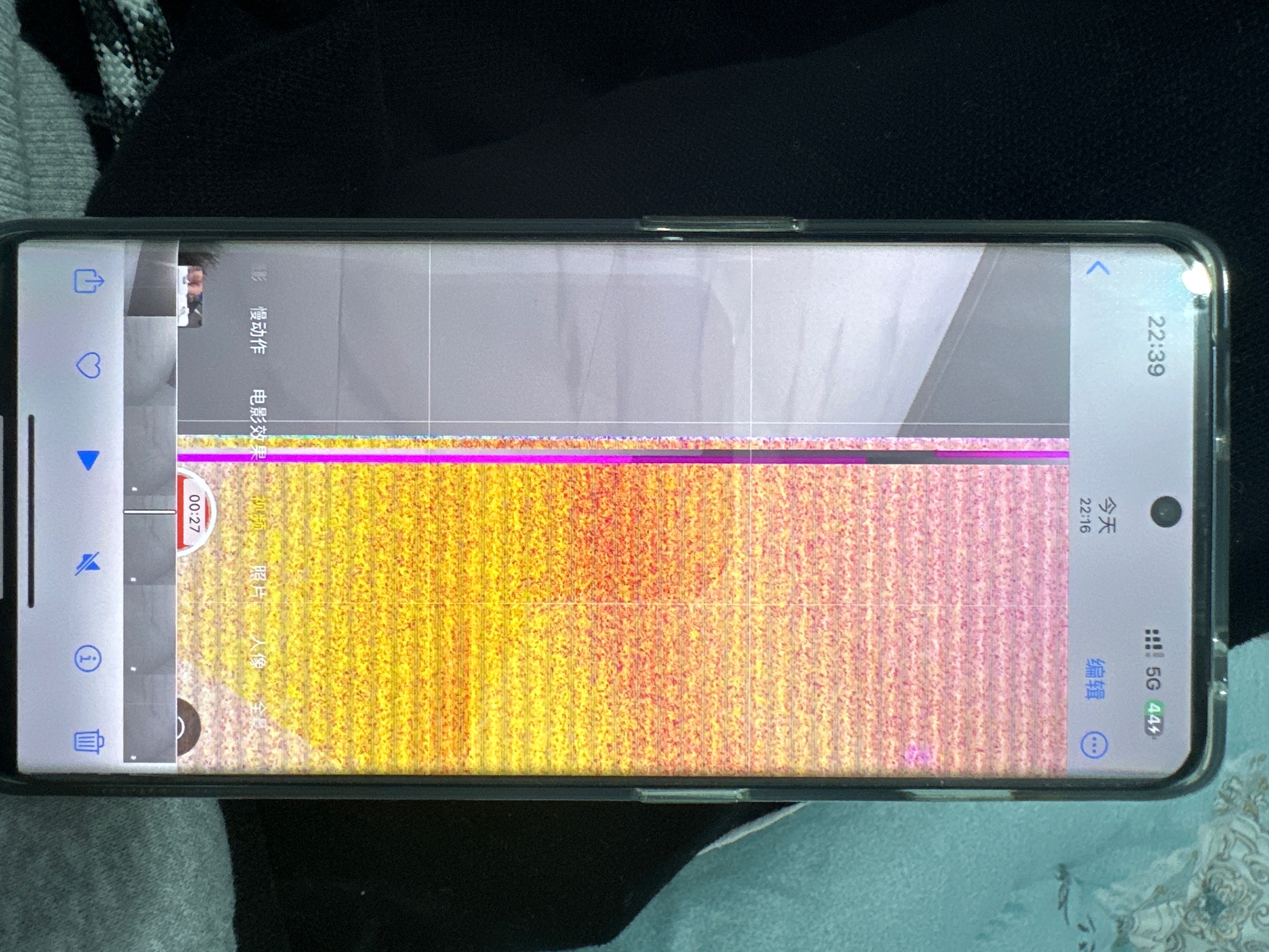 苹果14promix前置摄像头频闪并且出现彩虹屏,是系统问题还是手机硬件出现问题,由于视频较大,无法发出,借用同事手机拍照,请官方查验