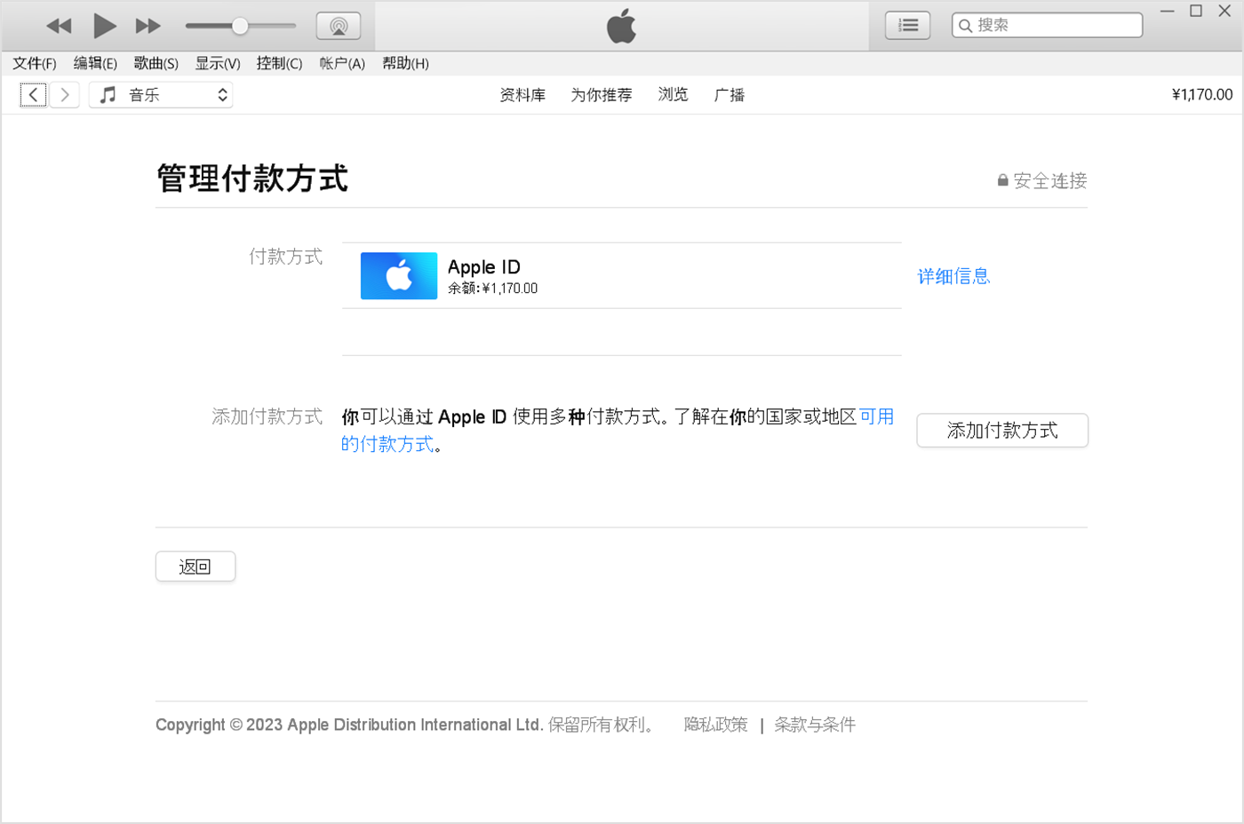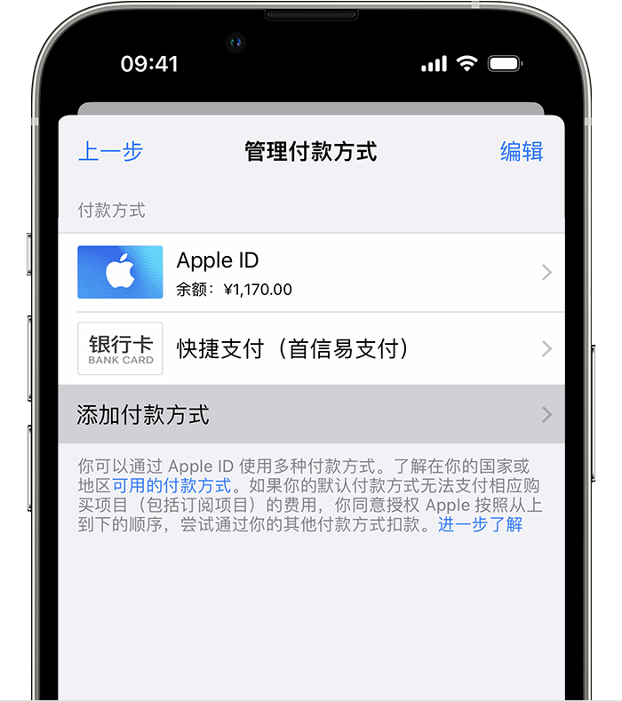 要从 App Store 购买项目并使用 iCloud+ 和 Apple Music 等订阅,你需要至少登记一种付款方式。
