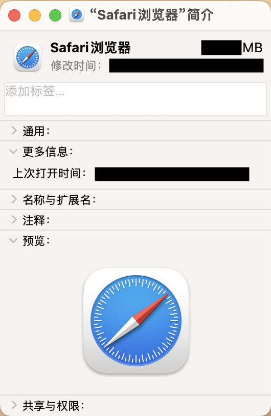 1. 如果图标问题有妨碍到美观,可以在访达中找到Safari.app,单击选中,按下Command+I进入简介页面(如下图),然后下载一张Safari浏览器图标图片并且拖放到简介页面左上角的图标上。