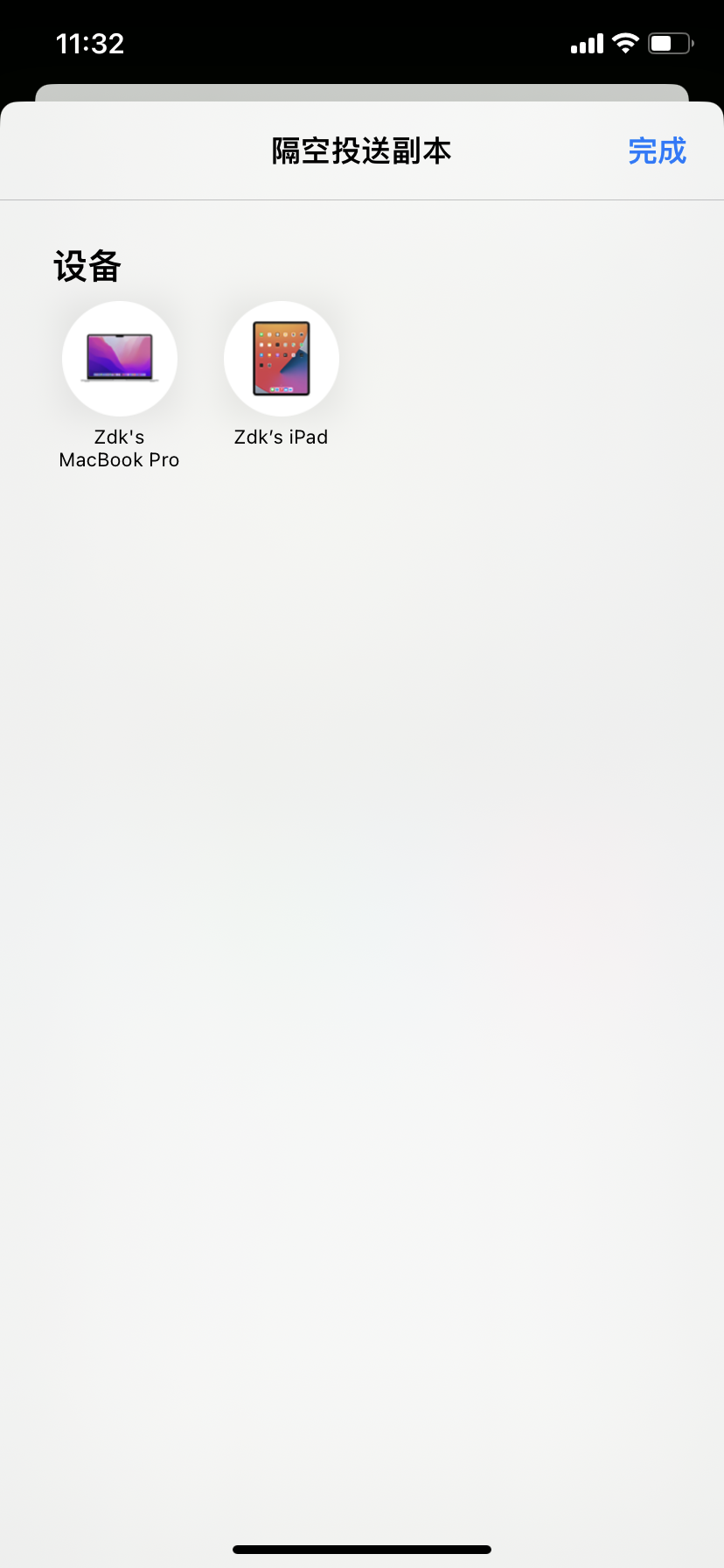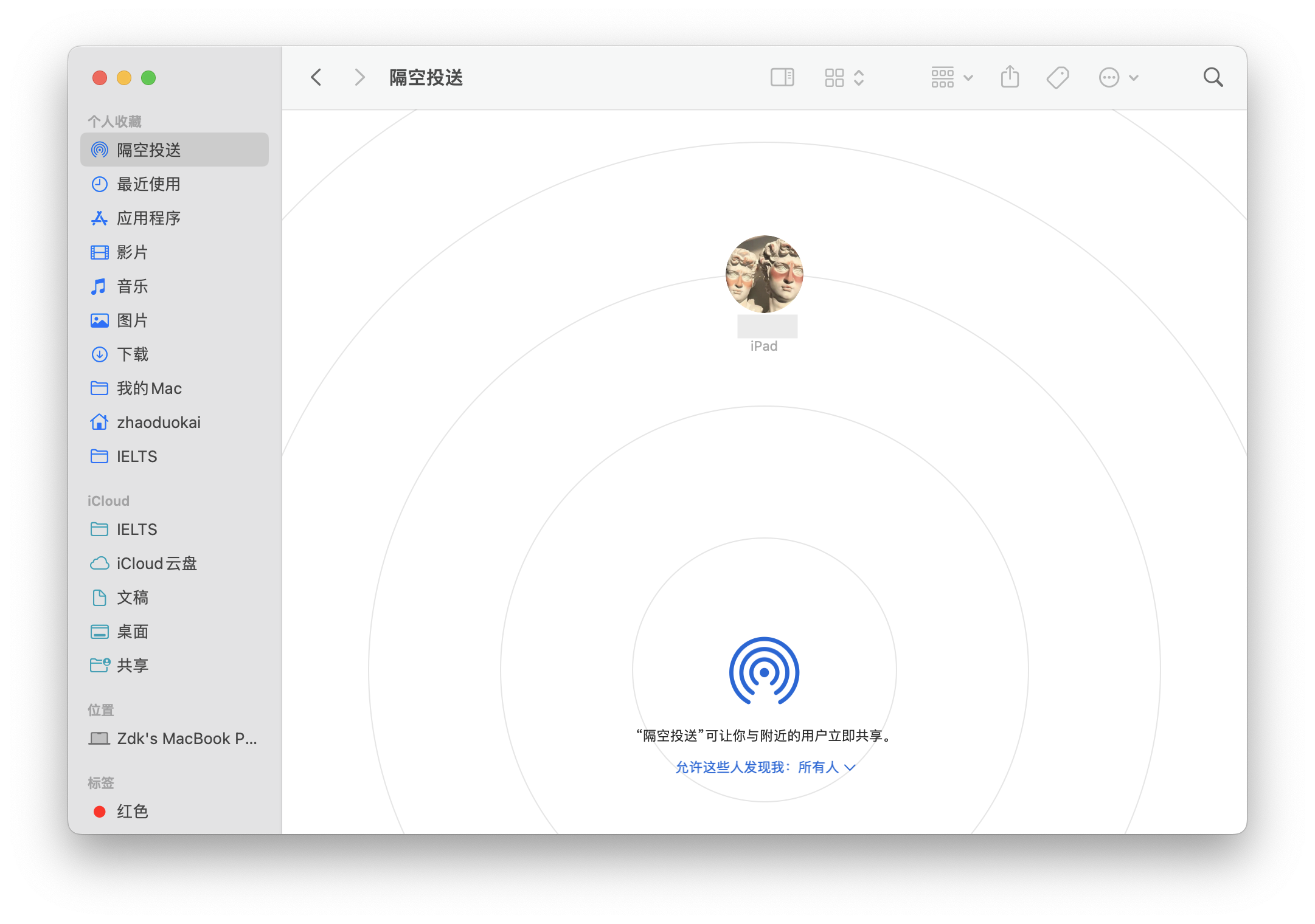 MacBook,iPad和iPhone登录同一个Apple ID,在MacBook中向iPad或iPhone隔空投送,显示的iPad或iPhone名字为通讯录我的名片的名字,而并非是iPad或iPhone的自定义的设备名字,如下图
