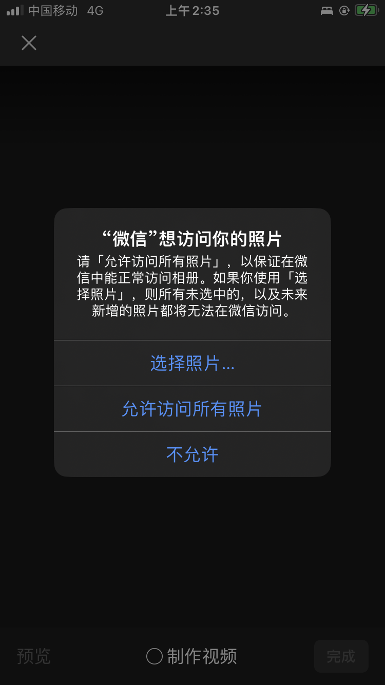 以微信为例,如果获取照片时点击“选择照片”后一张照片都没选就点“完成”,微信是不是一张照片都获取不了