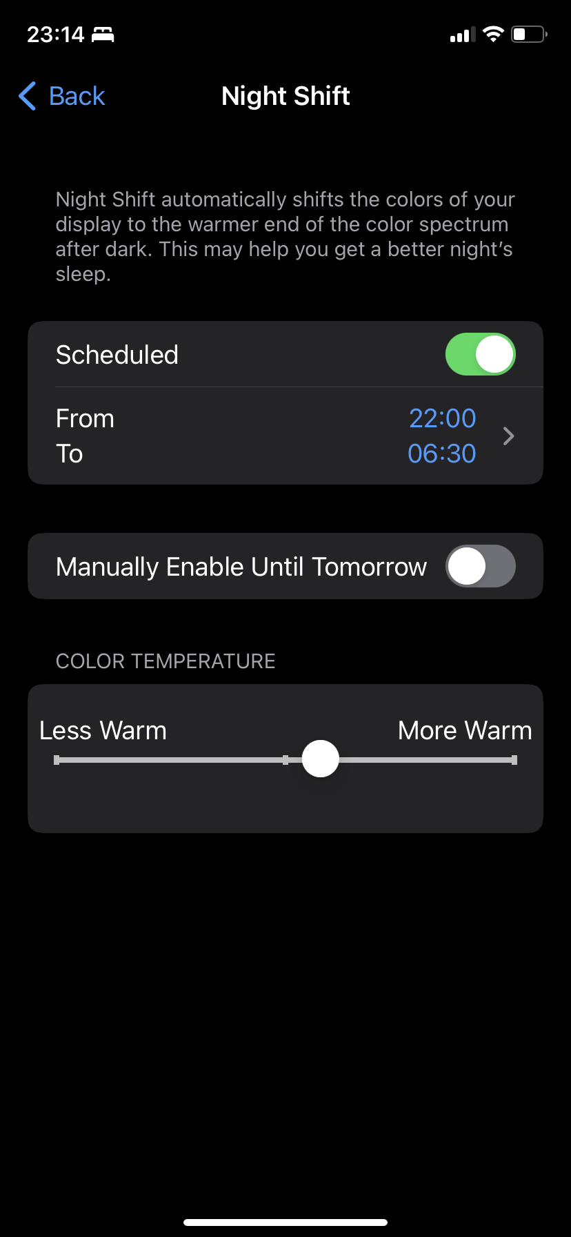 然后,"Manually Enable Until Tomorrow" 这个选项是一个手动控制 "Night Shift" 的开关。当你打开这个选项时,"Night Shift" 将被立即开启,并且会持续到次日早晨。这是一种快捷方式,让你能够在需要的时候立即打开 "Night Shift",而不必等待它在预定的时间自动打开。