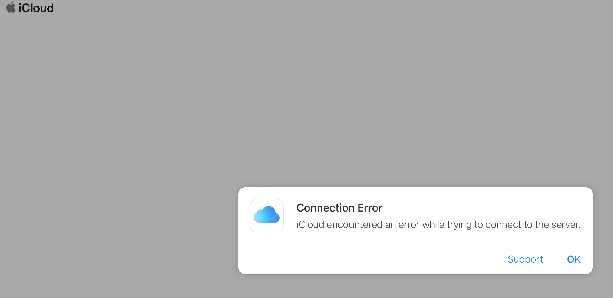 AppleID国家/地区为中国时,一切正常。但如果修改为加拿大,在iCloud.com上输入正确账号密码后,会出现服务器连接错误,如上图所示。