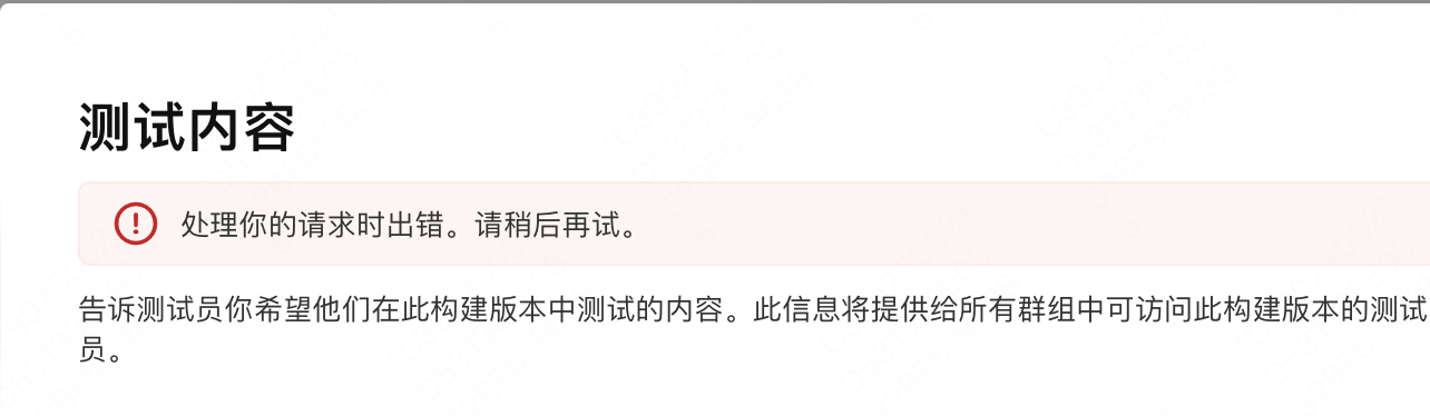TestFlight 建立外部测试出错,显示“处理你的请求时出错。请稍后再试。 ”