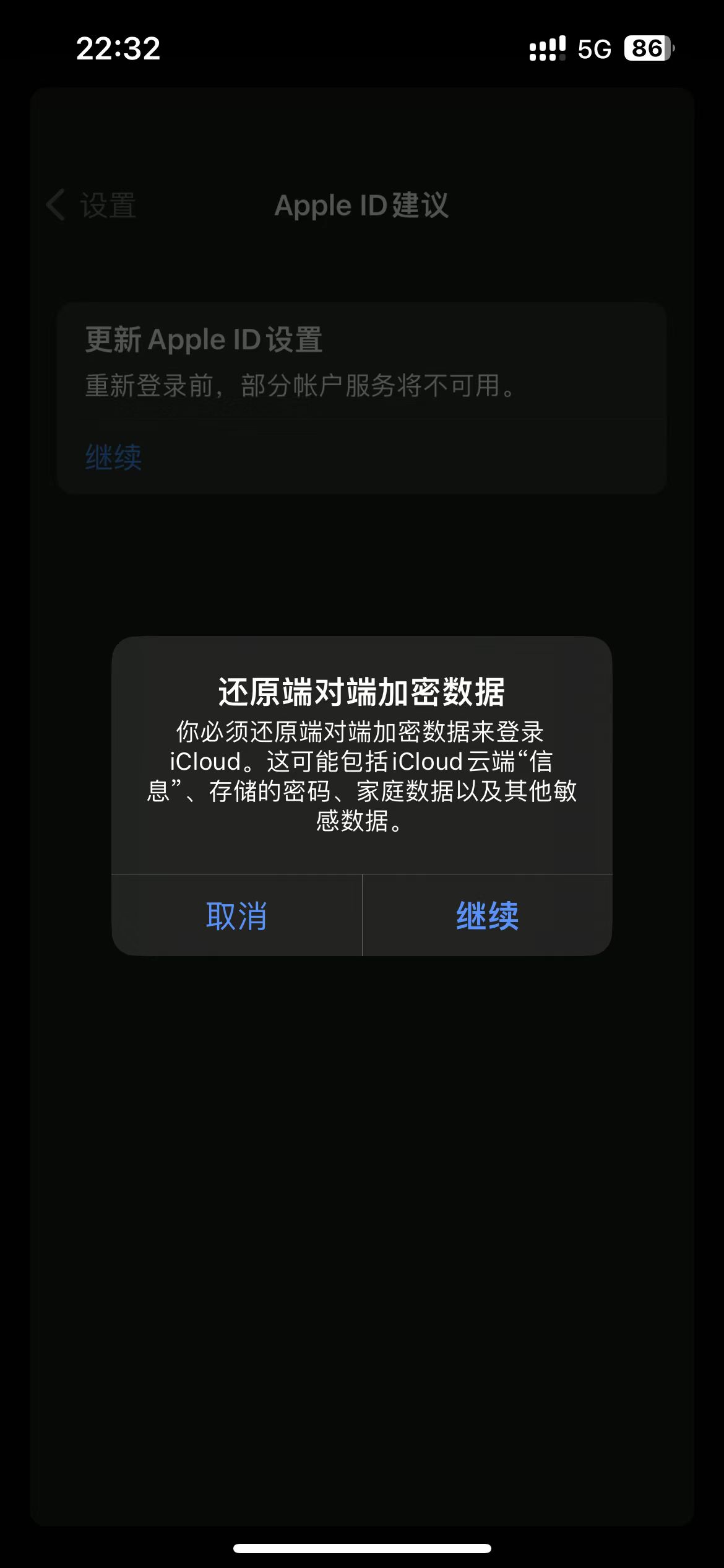 更新apple id 设置每次都在还原端对端加密那一步卡死怎么处理