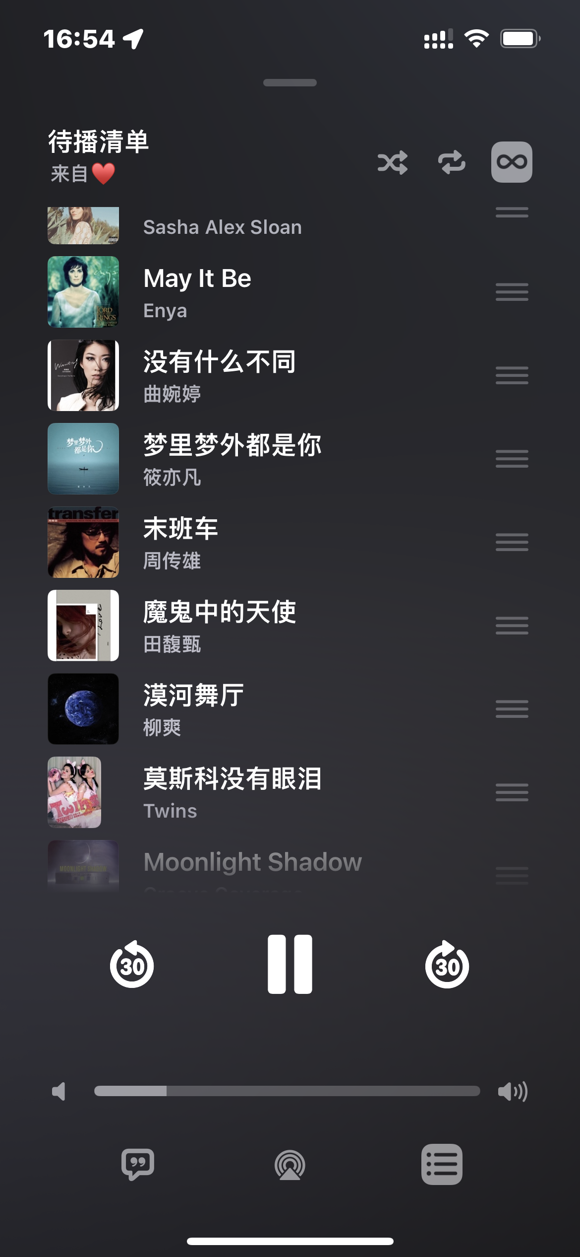 苹果音乐播放列表音乐正常点播放时只显示快进30秒,没有显示上一曲下一曲,随机播放,才会显示,但随机播放的曲目总是固定的那几首,不能随机播放整个列表里的曲目。