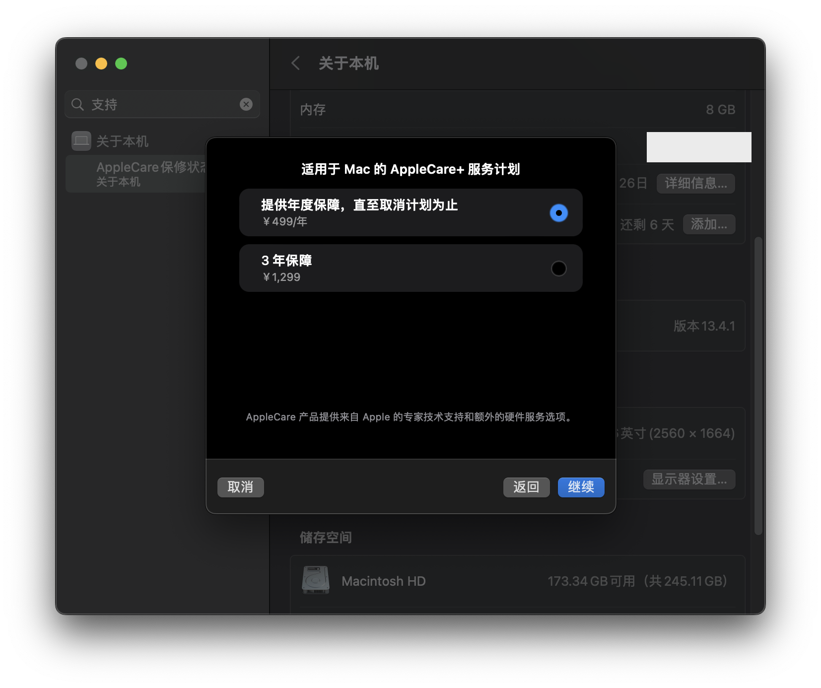 如果购买固定时长的AppleCare有可能不能一直续费,比如一次性购买2年,到期后唯一的续费通道是:关于本机里面会推送一个续期按钮,这个按钮不一定会推送。也就是如果需要一直续期,建议购买年度计划,因为只有年度计划每年都会⾃动续订。