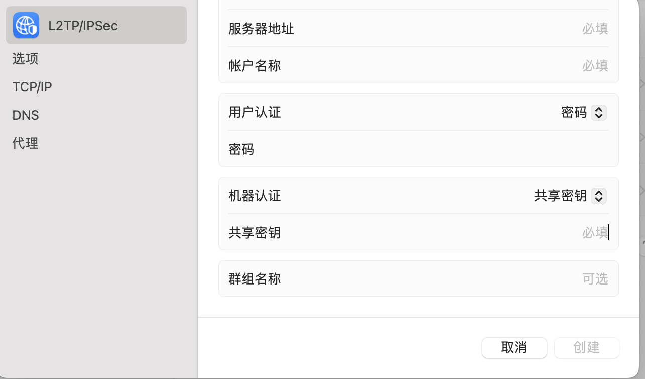 公司给的VPN(用来连接内网)只有IP地址,账号和密码,没有共享密钥和证书什么的。之前在Windows上只添加VPN时就只需填写IP地址,账号和密码,很方便。现在换到Mac,必需让填什么共享密钥或者证书啥的,不然创建都不让创建,关键是网上都没教程,简直离大谱