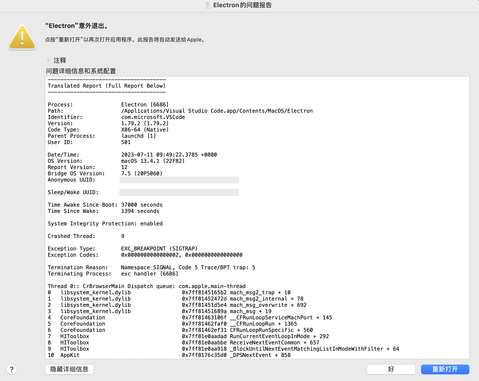 好的 感谢。 当时这几天问题依旧,而且同时一直有另一个报错:too many open files in system ,这个是把android studio 关掉就好了。我日常是做开发需要频繁使用vs code/idea/android studio 这三个软件。遇到闪退之后,每次重启都会变好,当时坚持不了多久。所以现在上班都是一天重启4-5次。