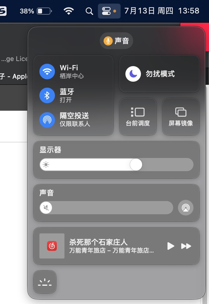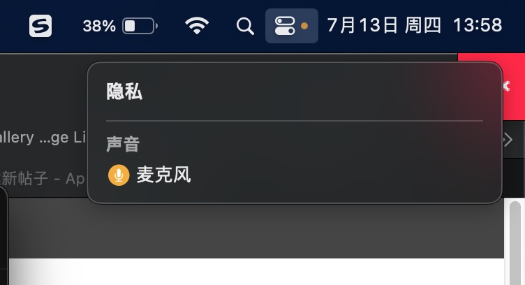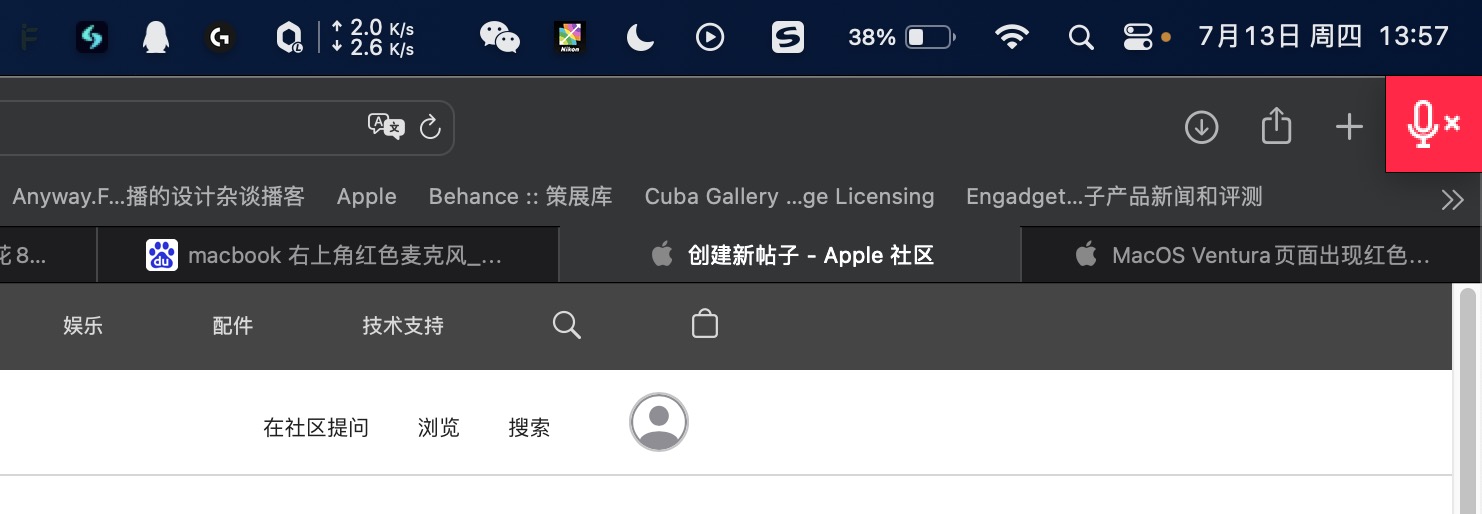 页面右上角持久出现一个红色方框,里面有一个🎤麦克风和×叉的图标,菜单栏也有同样图标,无法进行操作