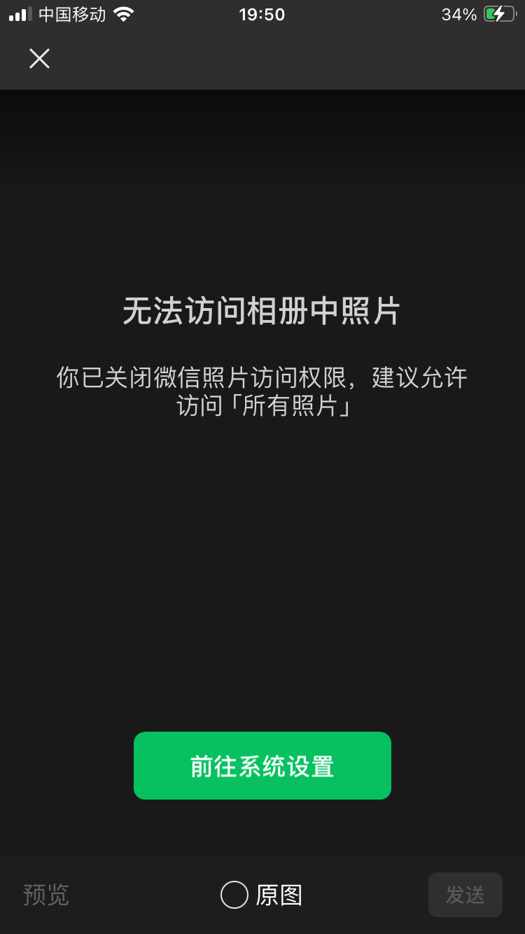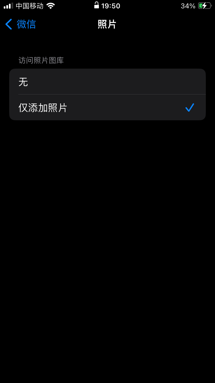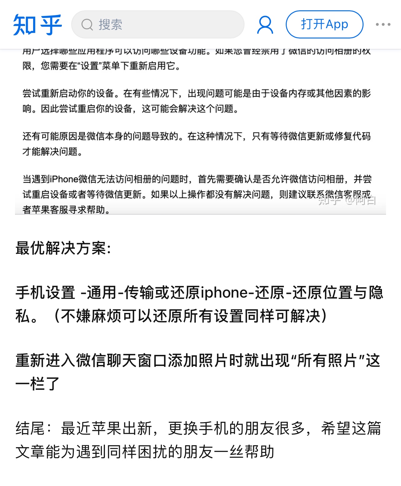 我的原来只有两个选项,没有所有照片,最后尝试成功了:通用-传输或还原iphone-还原-还原位置与隐私,点击后再进入微信,问题解决。