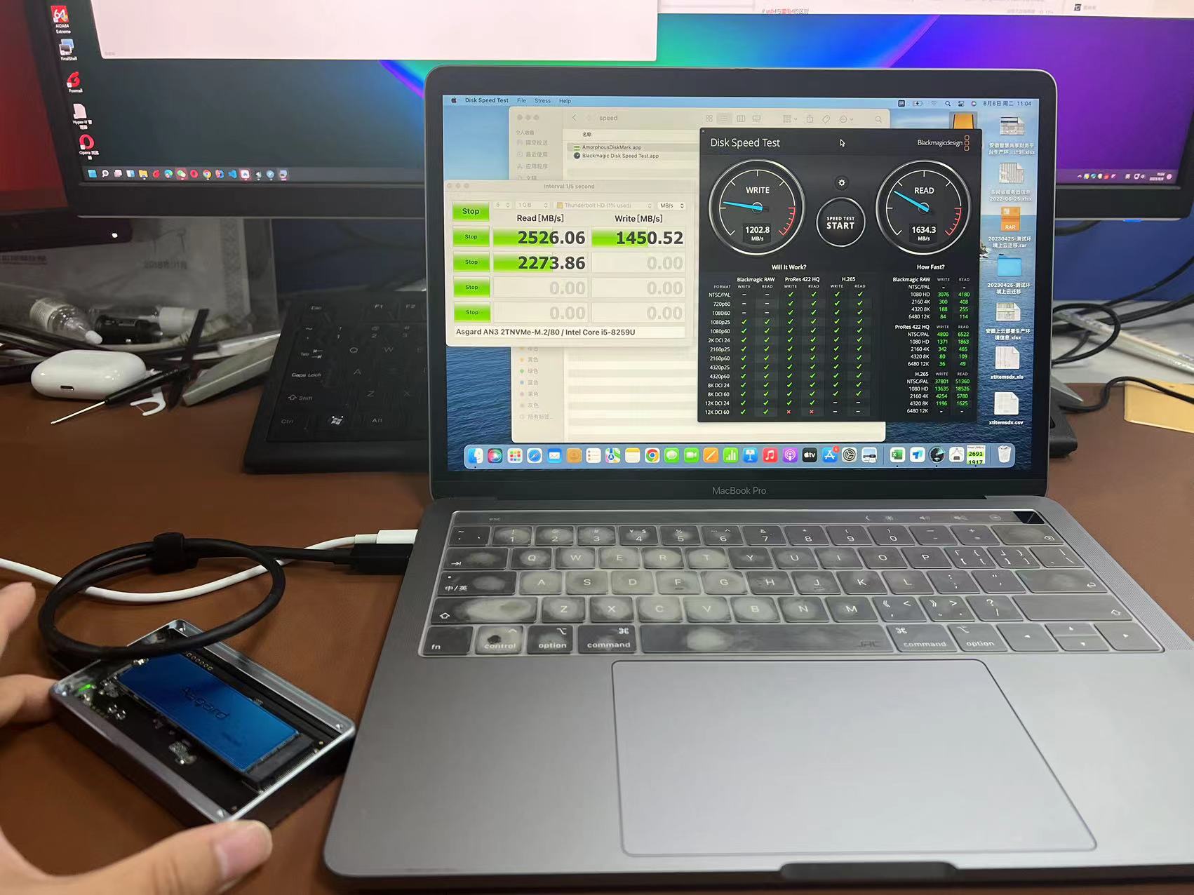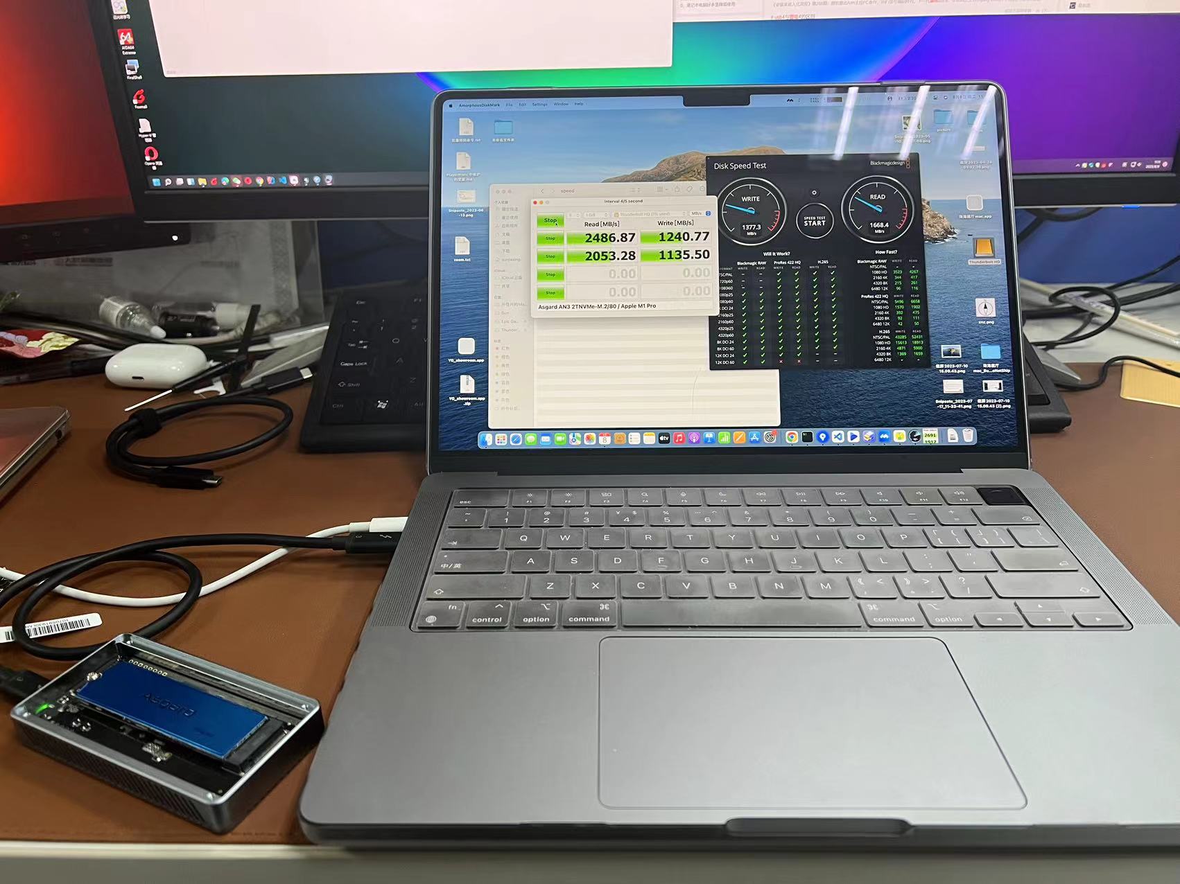 使用同样的硬盘+硬盘盒,我换到同事 19款 13寸MBP 和 21款 14寸的 MBP 上, blackdiskmagic测速实测结果 2400MB/s 到 2500MB/s, 写速度似乎减半了, 但这个结果也远远好于我的 air15。