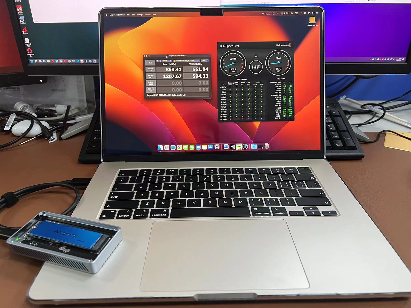当硬盘+硬盘盒一起链接到 air15上,设备管理中显示的 雷电接口设备 和 NVME设备都是正确的, 但是用blackdiskmagic测速实测结果这种形势下, 读写最多只能跑到 800MB/s ,而且速度还不稳定。
