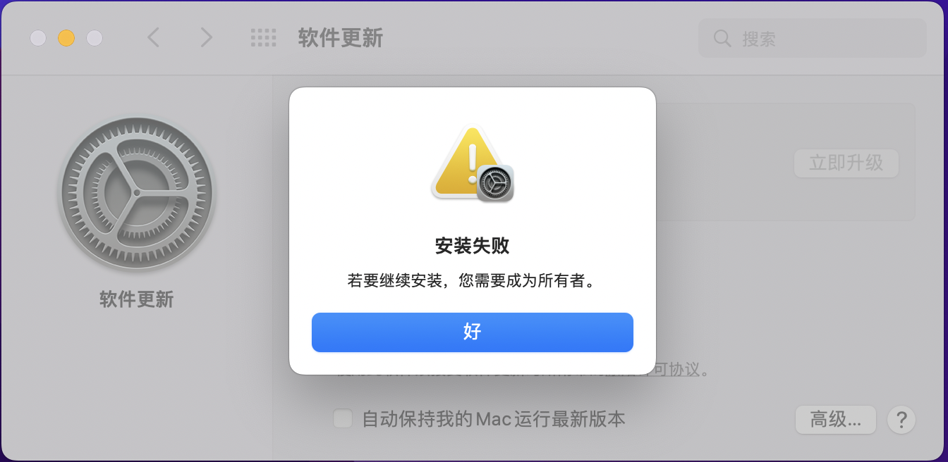 安装失败 若要继续,你需要成为所有者。之前有人说到“系统偏好设置”改“文件描述”,但找不到“文件描述”在哪?如何才能成为所有者呢?