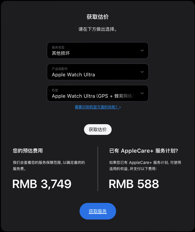 没有 AppleCare+ 的话,预估费用:RMB 3,749