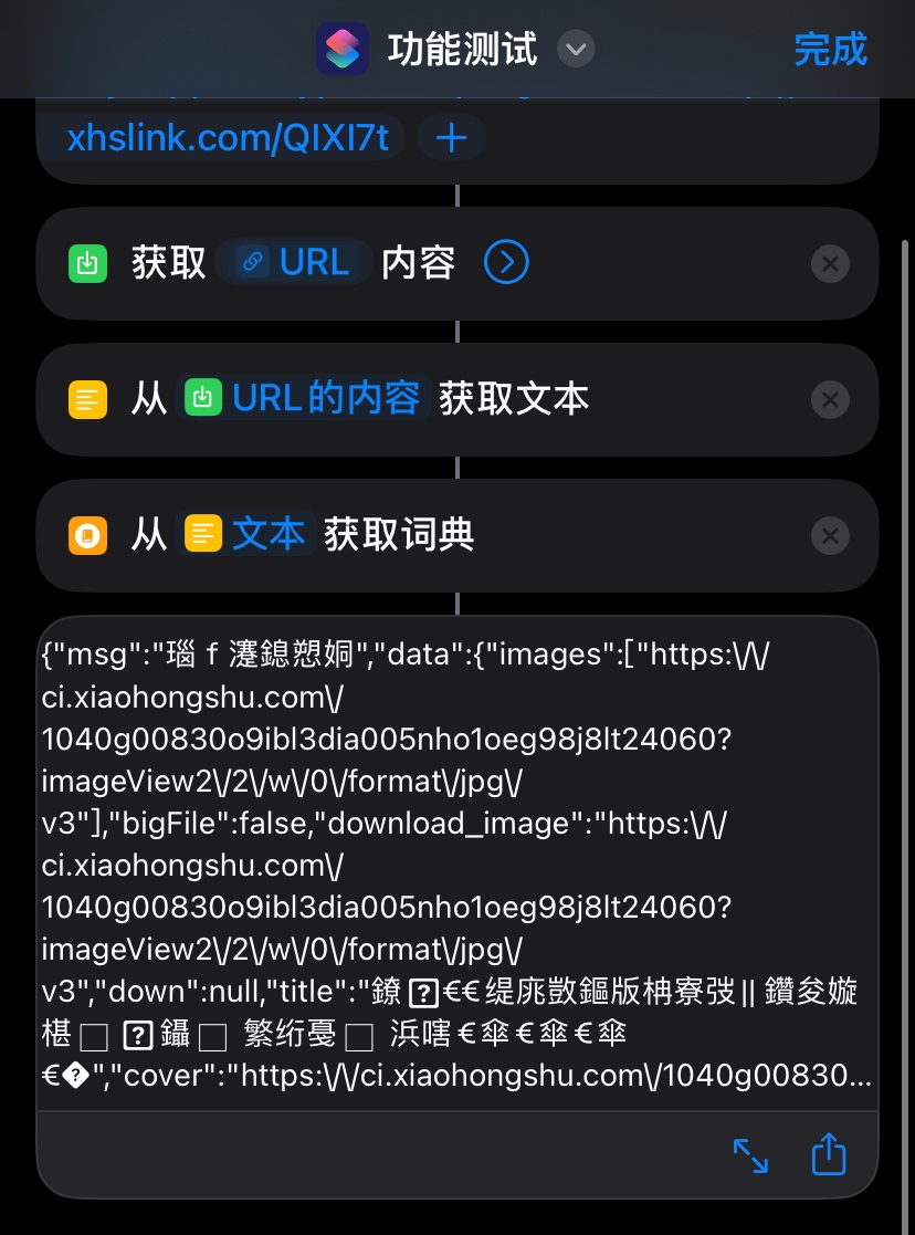 在iOS16中,获取url内容操作,访问一个接口并获得响应体,响应体是json格式,但是由于接口后台问题,导致中文变成乱码,并且不能直接使用“从xx获取词典”,必须先获取文本然后从文本获取词典。