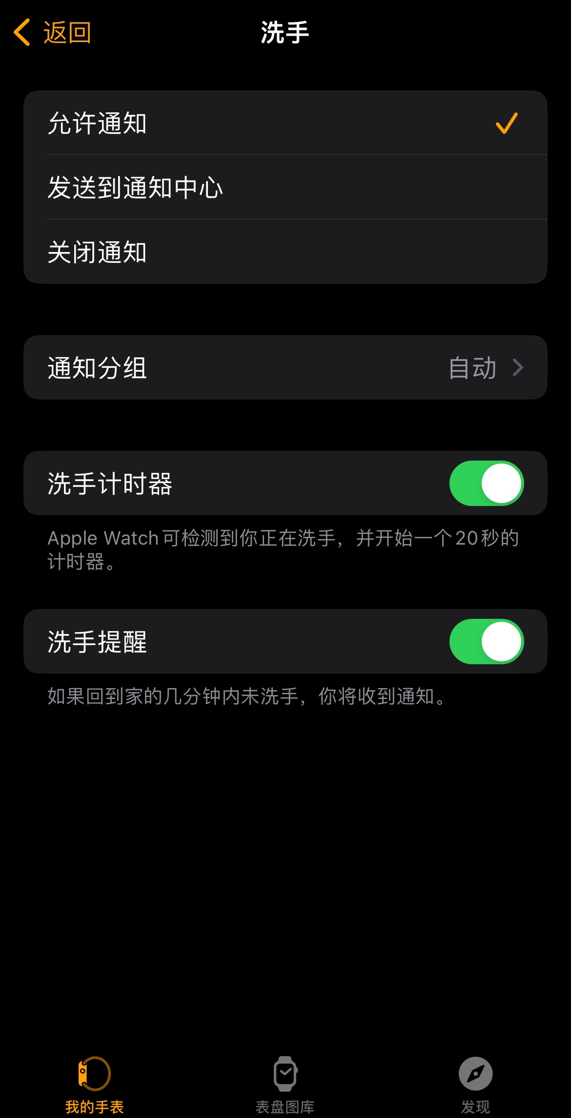 要在手机上打开。关闭时手表上是灰色禁用的。还有,你要在定位服务里打开“洗手”,这样才能回家时收到洗手通知。而且,你要在通讯录里把自己家的地址加到自己的名片里。