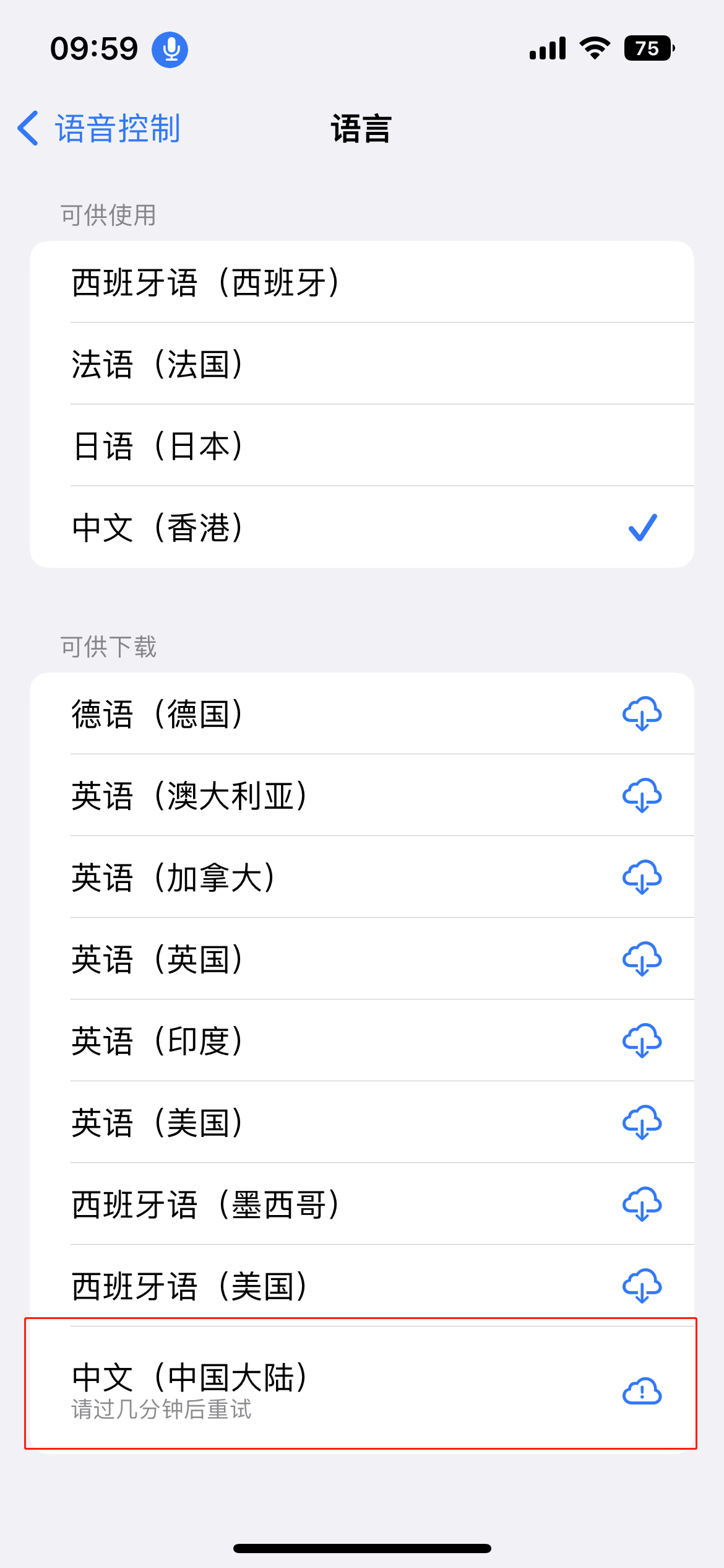 苹果13手机,语音控制无法下载中国大陆中文,其他国家语音都可下载。