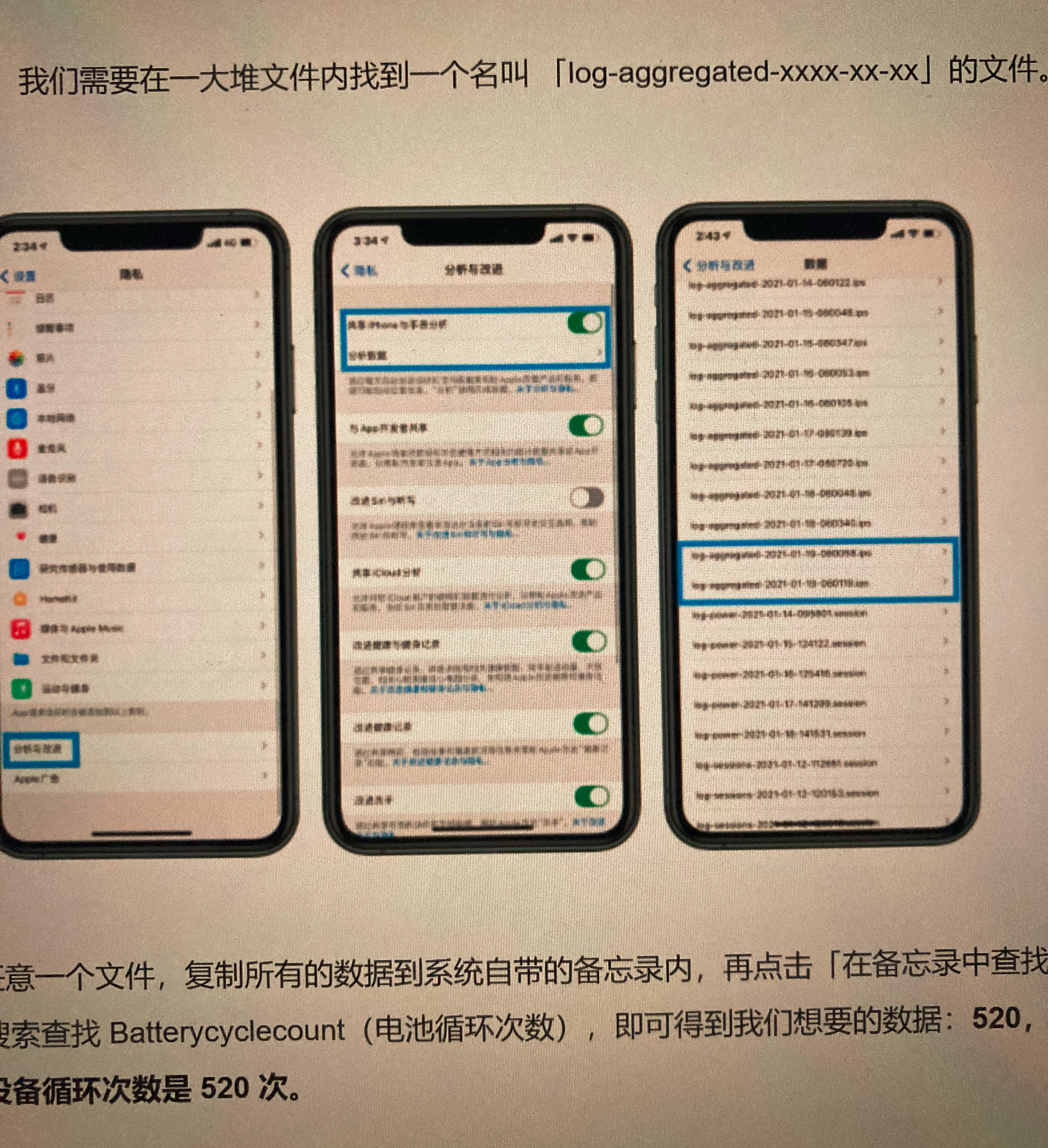 手机:设置——隐私——分析与改进——分析数据,这里有很多日志,看日志名称日期新鲜的。我熟悉了日志结构后,现在是直接在日志里翻找“Batterycyclecount(电池循环次数)”!