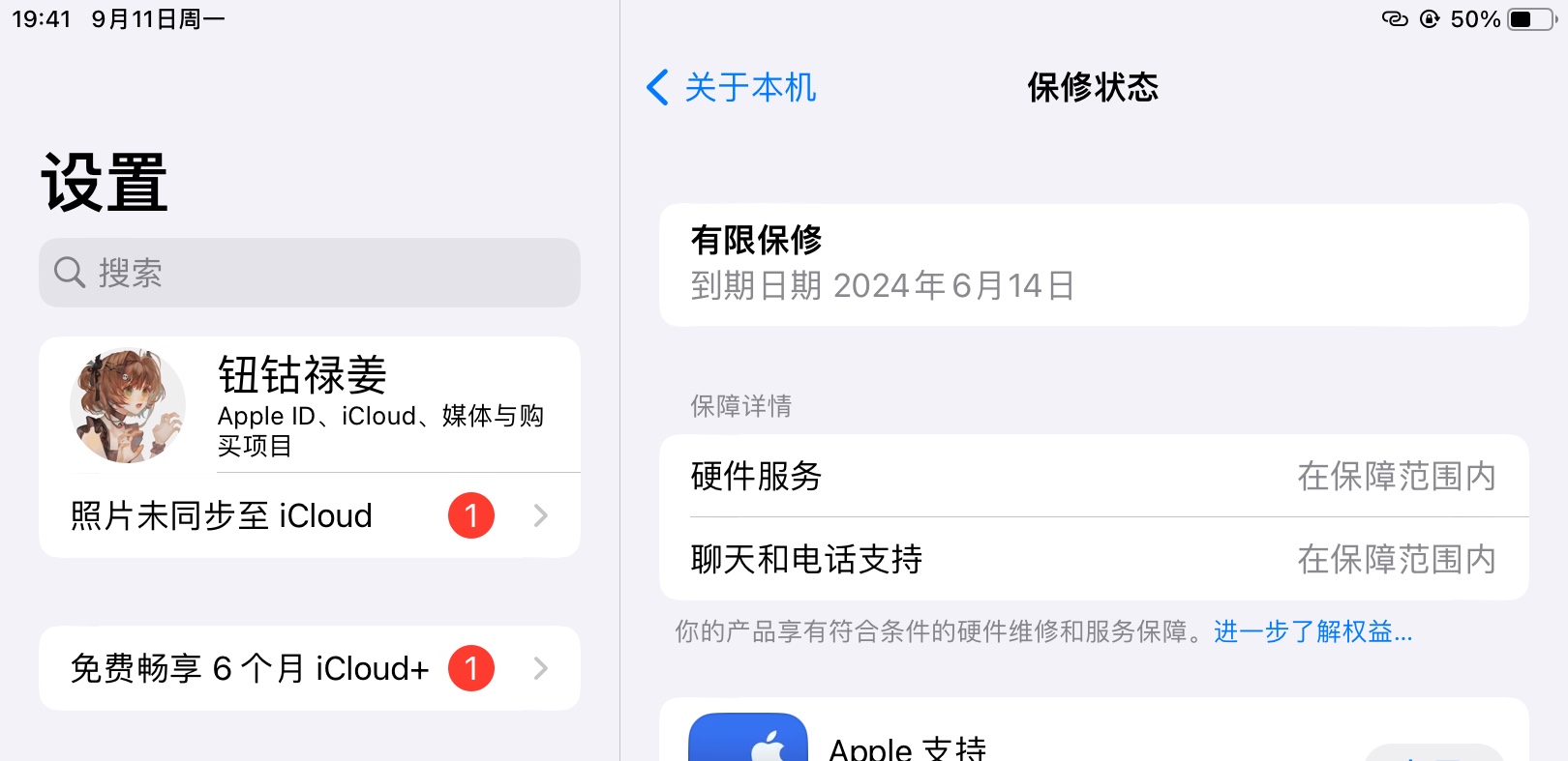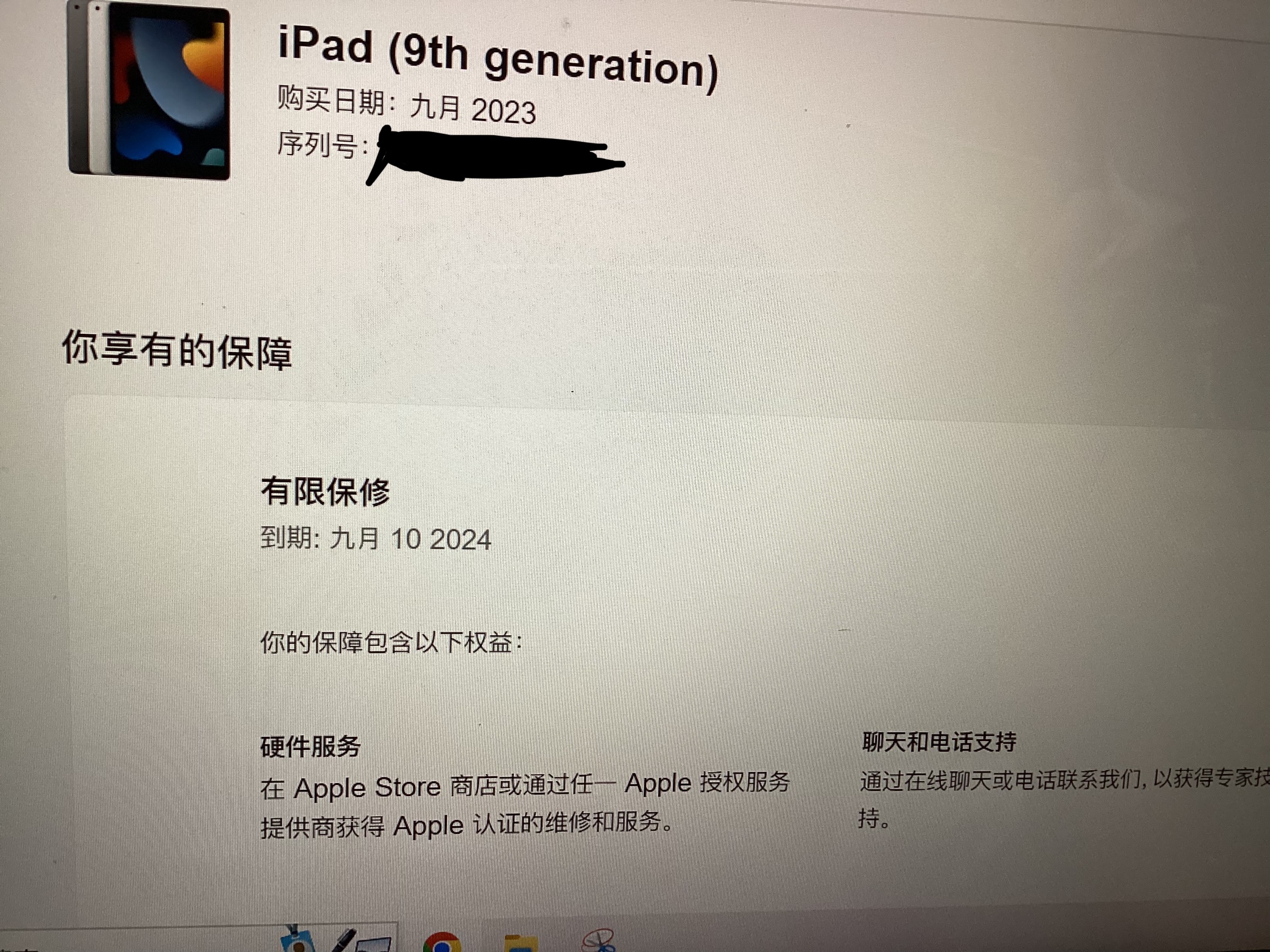 新买的iPad9,今天晚上刚拿到手开机后看到保修期到24年6月14日,吓坏了。于是赶紧去官网用序列号查询,结果显示是24年9月10日。不知道为什么设备上显示的日期会不一样,这台机子有问题么?