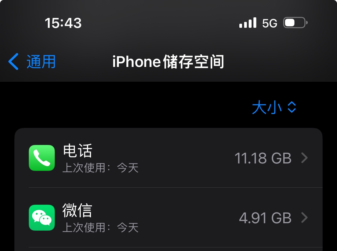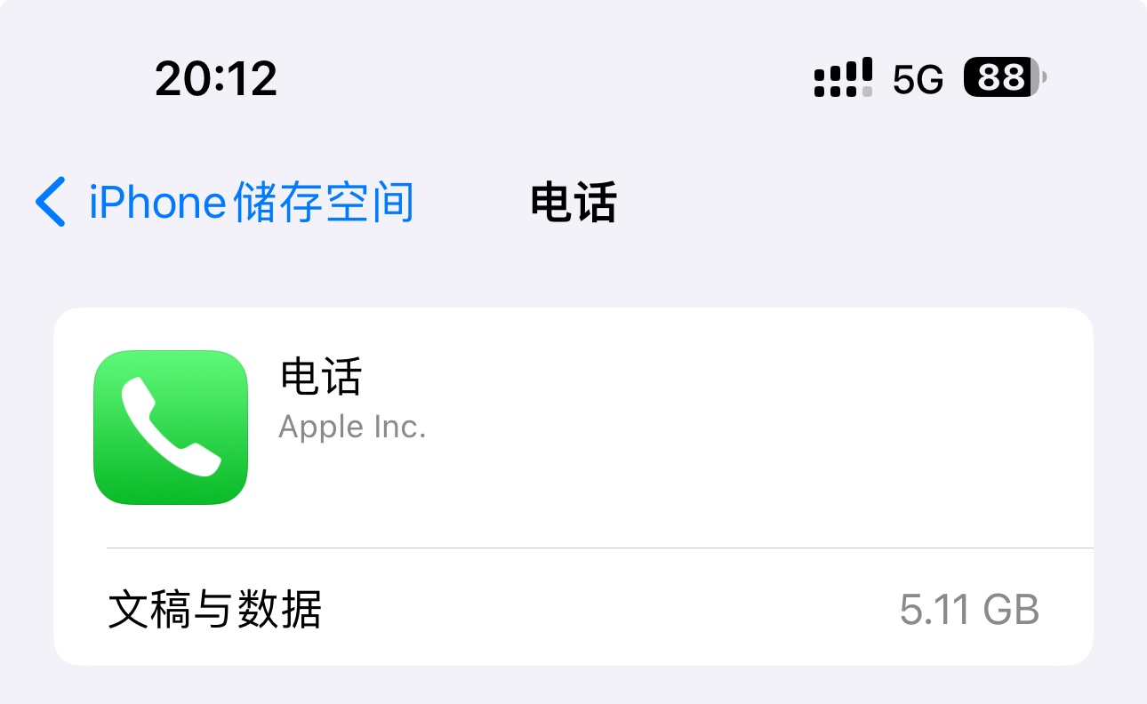 我今天查了一下,电话应用已经占用11.18G了!Can you believe it? 而且还在慢慢增长中。竟然有个应用比超越微信,而且还是遥遥领先,真是不可思议。而且伴随着容量增大,有时点某位联系人都会卡顿,太不iPhone了。