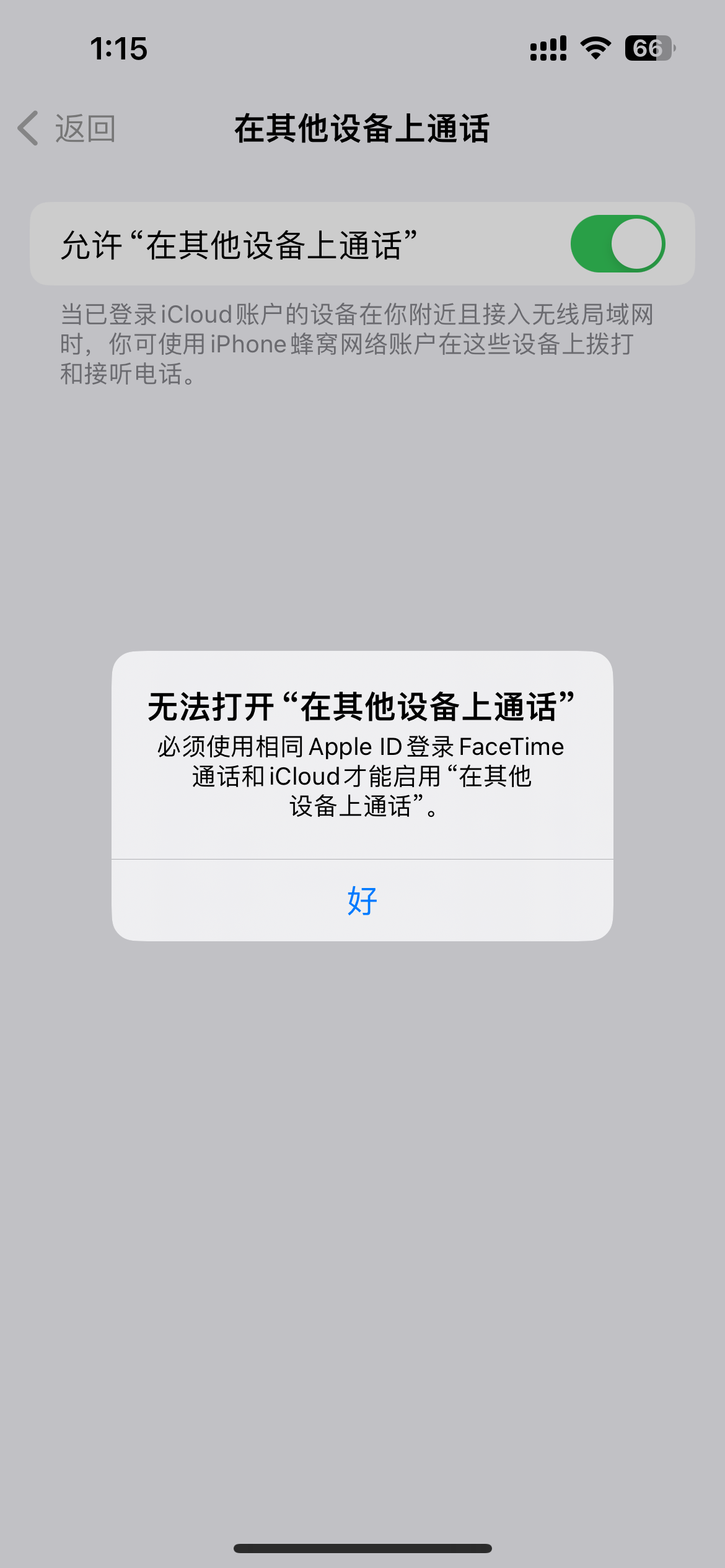 显示 [必须使用相同的Apple ID登入FaceTime童话和iCloud才能启用 在其他设备通话]