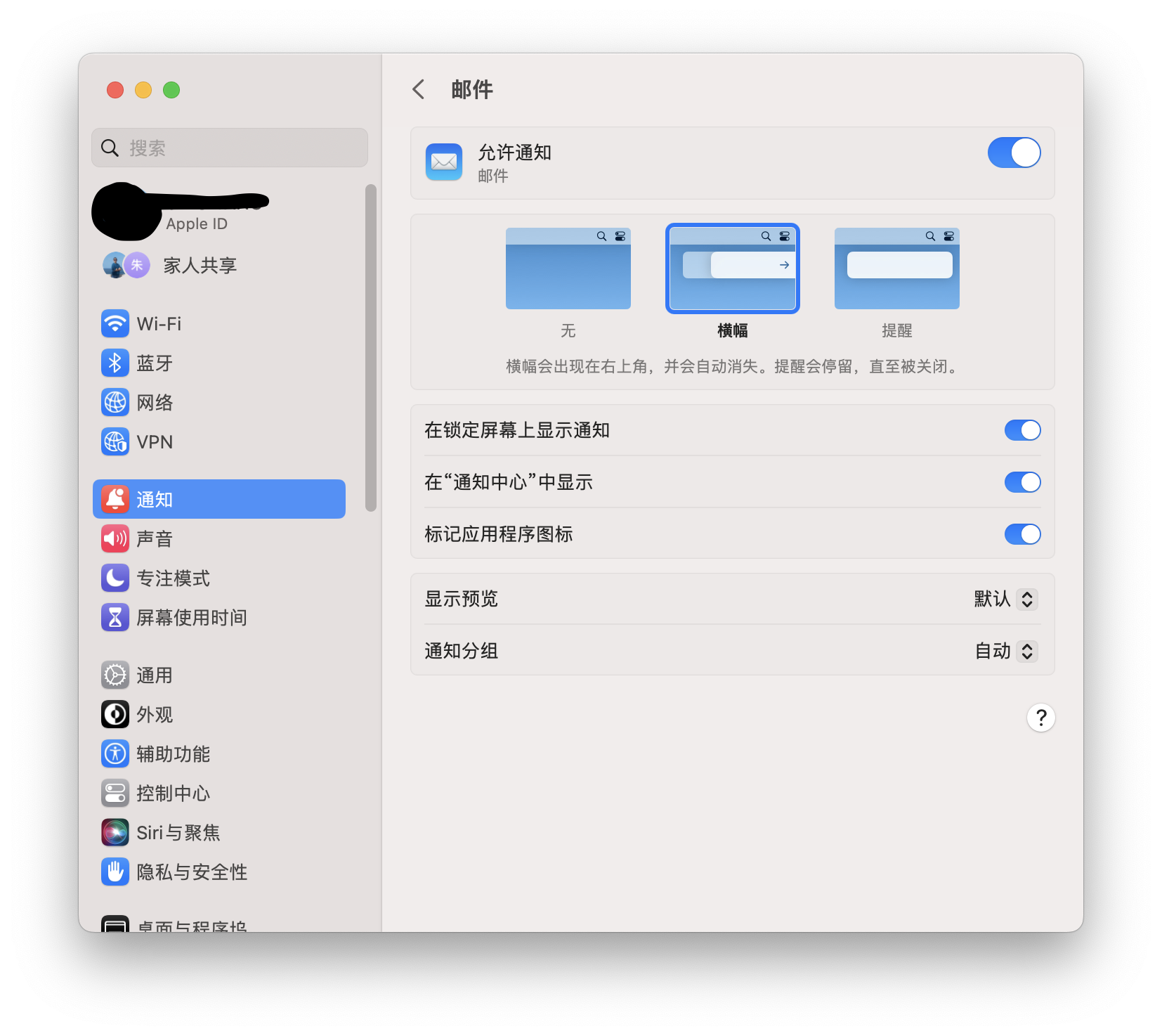出现以上问题之前,已确保邮件.app的通知设置如下,已全部打开。
