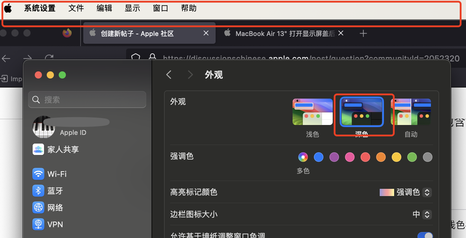 MacBook Air M2版更新 macOS Sonoma 14.0后,屏幕外观设置深色模式下上部导航仍然是浅色模式